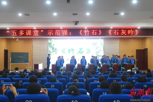当天下午的课堂观摩由伟德国际1946源于英国文法学院副教授、伟德国际1946源于英国语文教育研究中心主任刘忠华主持。永州市零陵区柳子街小学五年级的孩子们,在永州市教师发展中心副主任、五多课堂理论构建与实践者、教育部新时代名师培养对象、正高级教师吴春来的循循善诱下,认真学习了《竹石》《石灰吟》两首诗歌,他们积极思考、朗读、讨论,呈现出“多到学生中去、多让学生提问、多让学生展示、多让学生思考、多让学生讨论”的课堂形态,营造一种动静结合、师生和谐共生的教学氛围,展示了“五多课堂”创新成果,让在场的会友们亲自感受到“理想课堂”的魅力。