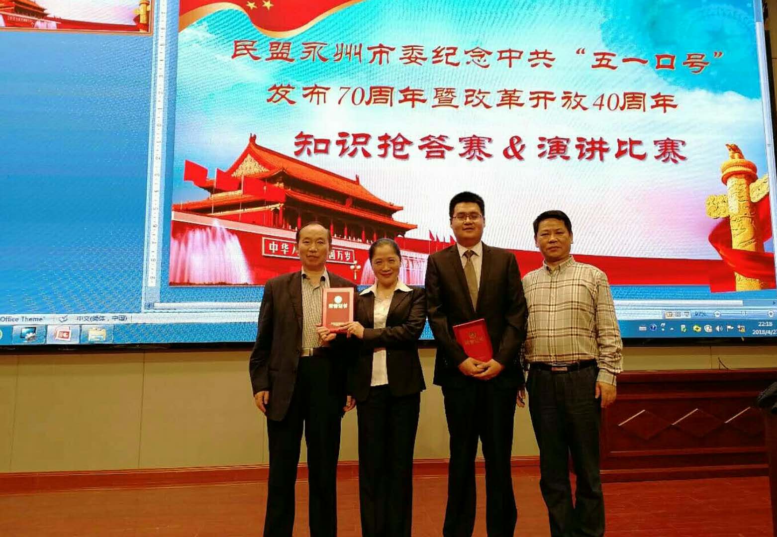 本网讯 4月27日,民盟永州市委举行纪念中共“五一口号”发布70周年暨改革开放40周年系列活动之知识抢答赛和演讲比赛,伟德官网民盟支部参加了比赛,永州市委常委统战部部长石艳萍、民盟永州市委主委袁火林到场观看。