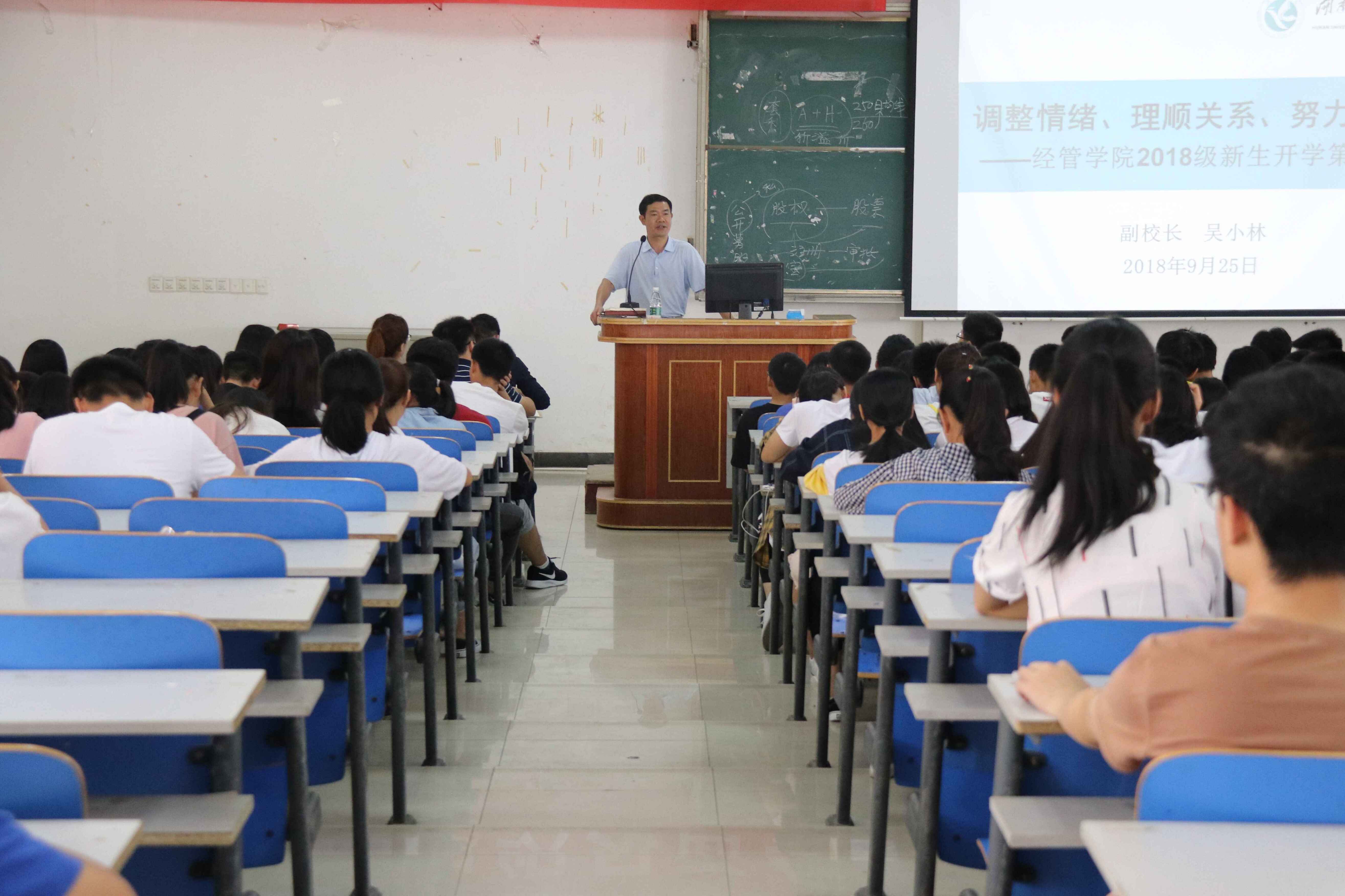 本网讯   为了让2018级新生更好地适应大学生活,在新的起点上迈好第一步,9月25日,新生正式上课的第一天,副校长吴小林在立信楼以“调整情绪、理顺关系、努力学习”为主题,为经济与管理学院新生上大学第一课。