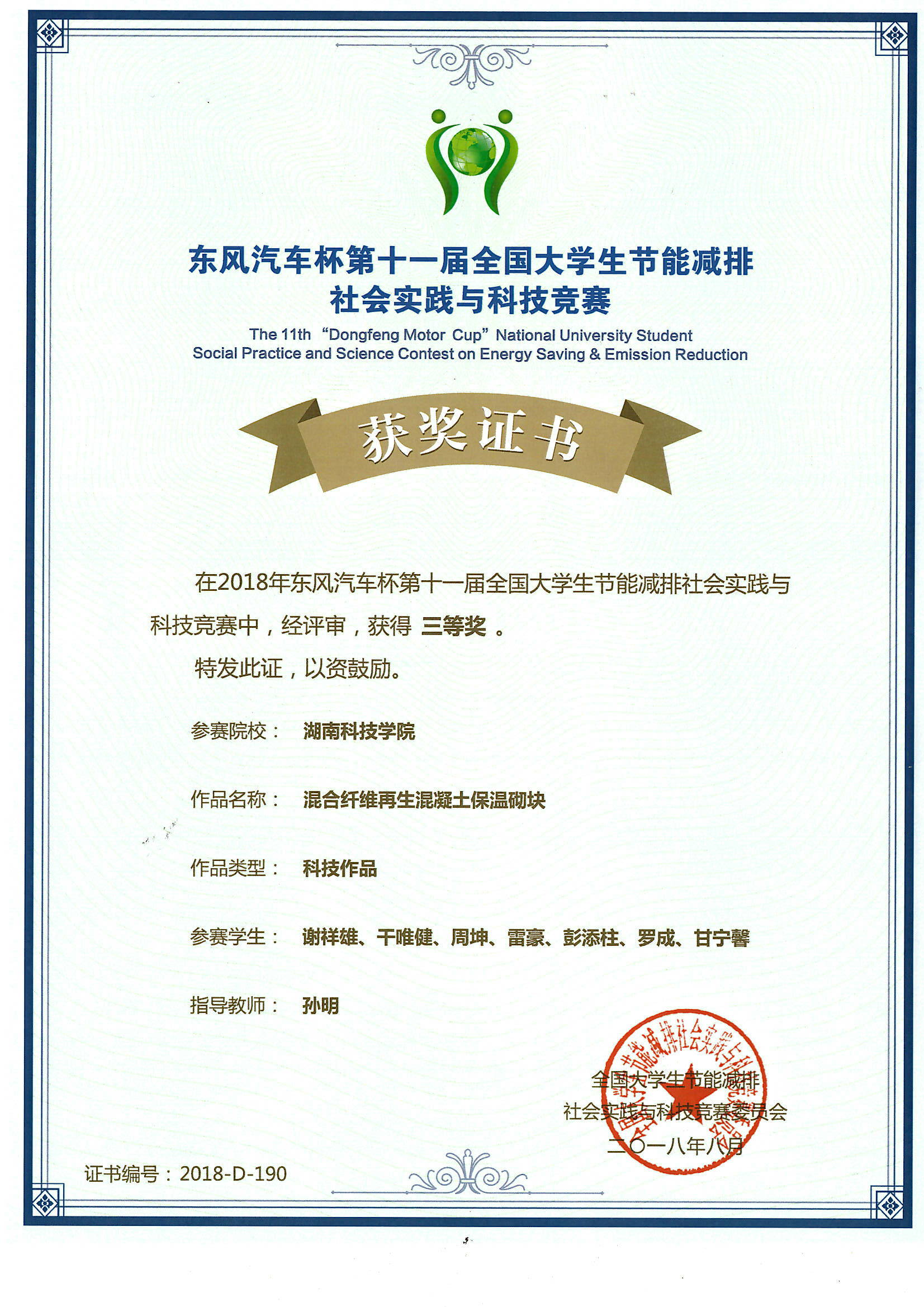 本网讯 近日第十一届全国大学生节能减排社会实践与科技竞赛公布获奖名单并下发获奖证书,土木与环境工程学院教师孙明指导的谢祥雄团队作品“混合纤维再生混凝土保温砌块”喜获三等奖,实现了土环学院在该项赛事上获奖零的突破,也是伟德官网第二次在该项赛事上获奖。
