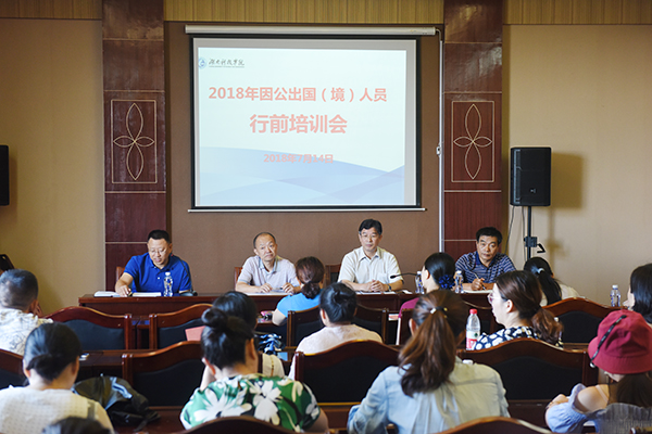 本网讯 7月14日上午,伟德官网2018年暑假因公出国(境)人员行前培训会在行政楼八楼三会议室举行。永州市旅游外事侨务局副局长刘璇以及永州市公安部门相关负责人应邀为师生作了专题培训,副校长宋宏福出席,国际交流与合作处处长郑际根主持培训会。