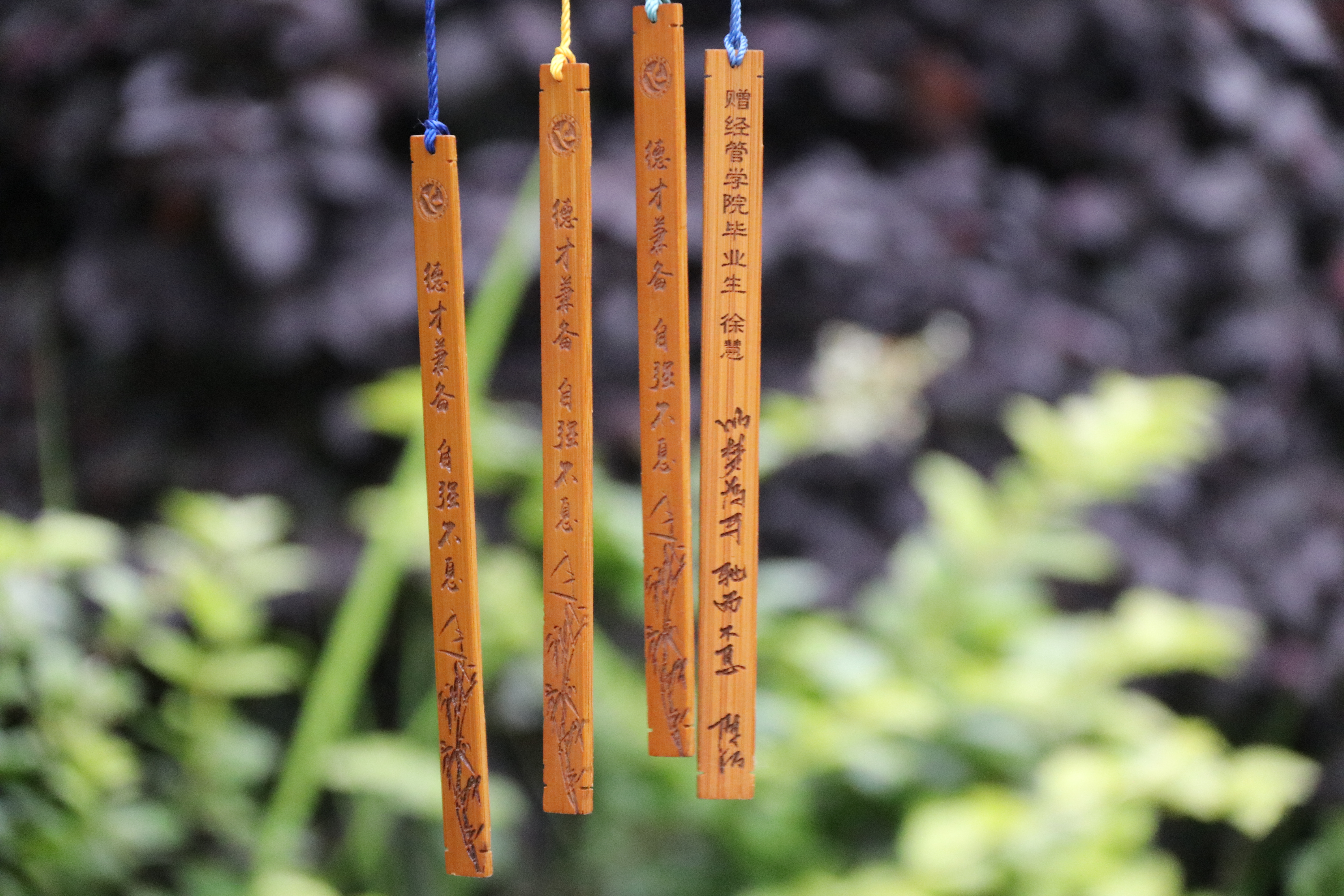 书签是木制长条形,一面刻有每一名毕业生的名字以及校党委书记陈弘书记“以梦为马,驰而不息”的寄语,希望每一位毕业生都能够怀着自己的梦想,永不停歇的愿望;另一面刻着伟德国际1946源于英国的校徽和“德才兼备,自强不息”的校训,同时还刻有竹叶,寓意着挺拔洒脱、正直清高的品质。