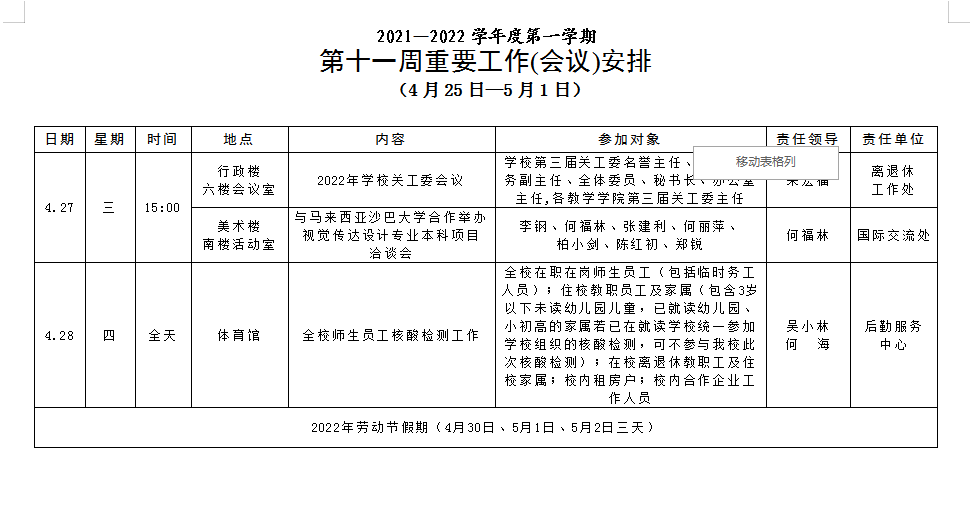 [党政办]第十一周重要工作(会议)安排(4月25日-5月1日)