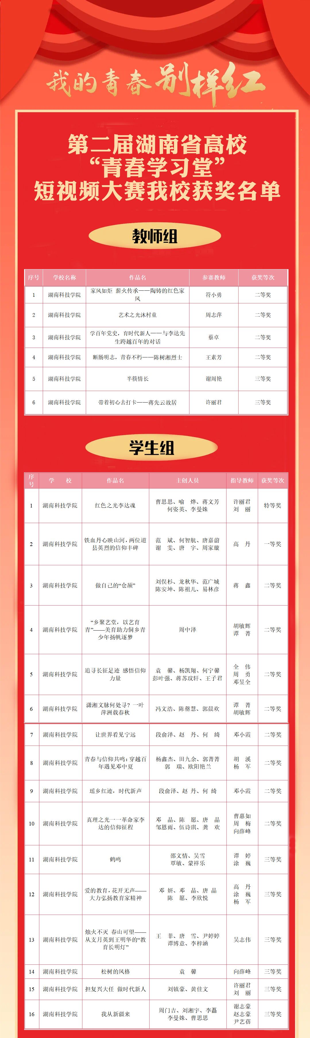 本网讯(记者 孙淑娴)近日,由中共湖南省委教育工委、湖南省教育厅、湖南日报社联合主办的湖南省第二届高校“青春学习堂”短视频大赛评选结果揭晓。伟德官网师生在赛事中表现优异,斩获特等奖1项、一等奖1项、二等奖12项、三等奖8项,并荣获“优秀组织奖”,充分展现了学校扎实推进思政教育的阶段性成果。