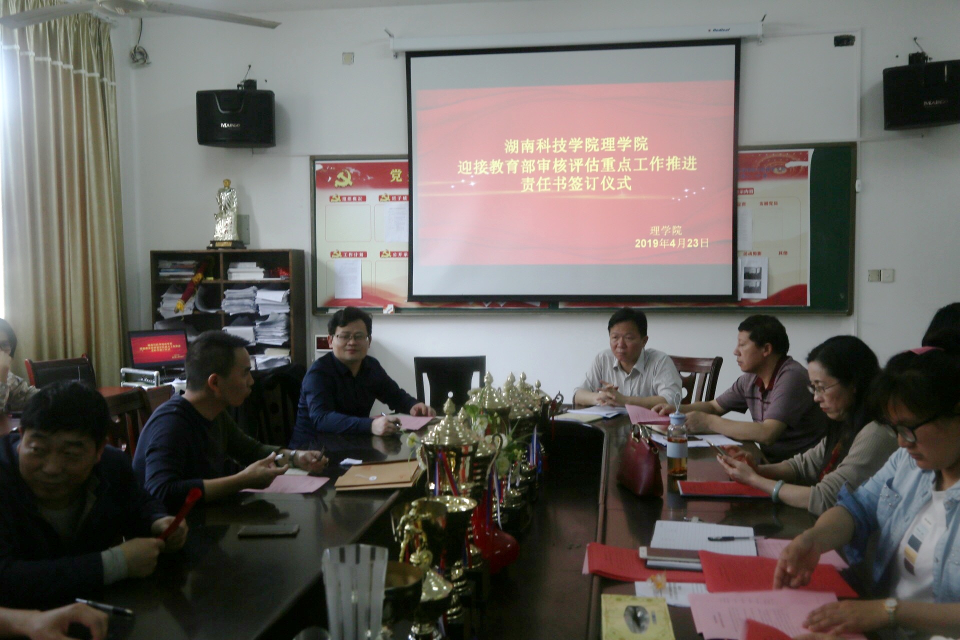 本网讯(通讯员 谢娟)为了高质量、高水平完成学校本科教学审核评估各项工作,切实把审核评估各项重点工作落实到各具体工作人员,4月23日下午,理学院于明理楼308举行审核评估工作责任书签订仪式,该院全体教师参加签订仪式。会议由该院院长唐耀平主持。
