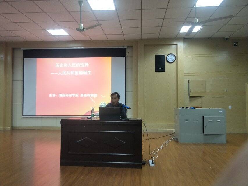 对入党积极分子进行培训,既是保证新发展党员质量,保持党的先进性和纯洁性的必要环节,也是帮助同学们了解党、深刻领会党员的义务和权利、树立共产主义信念的需要。本次分党校联合培训开班典礼主要有三个议程,典礼以全体起立奏唱国歌拉开序幕。随后由马克思主义学院思政1701班曾强强代表全体学员发言,曾强强表明了他本次参加培训的态度和决心:“我们会珍惜分党校培训的机会做到以下三点,一会提高自我认识,端正态度;二会遵守纪律;三会加强互动、增进友谊”。紧接着,理学院唐耀平院长进行了动员讲话,期间,唐院长对分党校联合培训的意义与目的作了深入阐述,同时对参加本次培训的全体学员表示祝贺和勉励。此外,也对全体学员寄语了三点要求:扎实开展理论学习;树立正确的人生观、价值观、世界观;自觉遵守学习纪律。最后,班主任曹惠如老师在开班典礼上明确了考核考勤要求与评优标准,并期望全体学员能严格遵守分党校培训的管理制度,积极投身于分党校培训的集中学习、自主学习与实践学习当中去,顺利结业,荣争优秀学员。至此,培训班开班仪式圆满结束。马克思学院唐森树教授以“历史和人民的选择——人民共和国的诞生”的主题为本次分党校联合培训开讲。