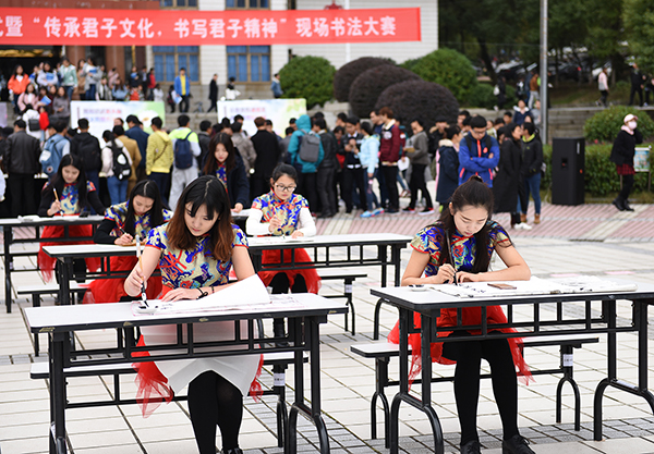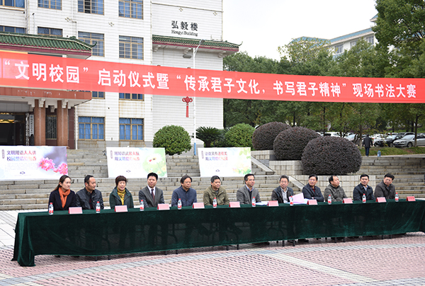 本网讯 为全面推进广大师生关心支持和参与文明校园创建,营造校园文化艺术节浓厚氛围,进一步展现伟德官网学子蓬勃向上的精神风貌。11月10日上午,学校举行创建“文明校园”启动仪式暨校园文化艺术节之“传承君子文化,书写君子精神”现场书法大赛。校党委书记陈弘,校长曾宝成及其他在校领导唐艳明、宋宏福、郑山明、吴小林、程智开出席。