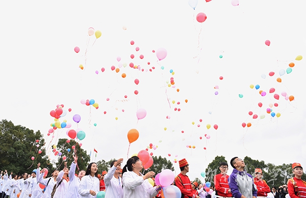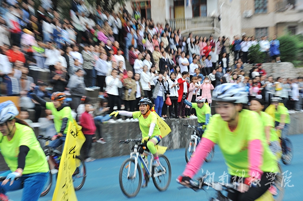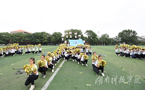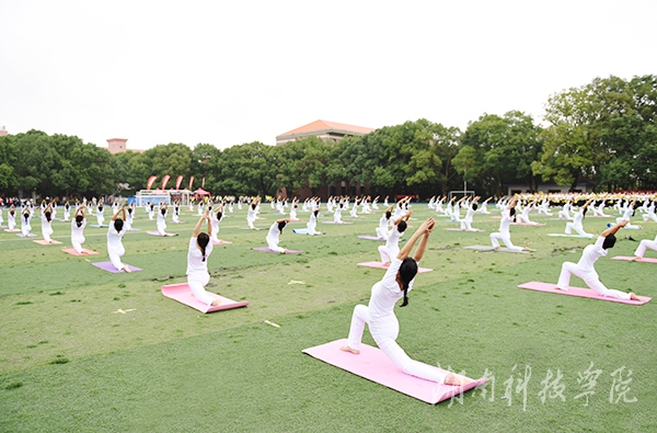 随即礼炮响彻云霄,五彩斑斓的气球放飞天空,全场欢声雷动。精彩的百人瑜伽表演博得现场师生拍手叫好,行云流水般的动作完美诠释了瑜伽的柔美,不同的体式紧密串联,一气呵成地展现了瑜伽运动的柔韧性、力量性。活力四射的加油操以及动感十足的单车表演,每一位表演者都用自己的热情感染着现场的每一位师生观众。