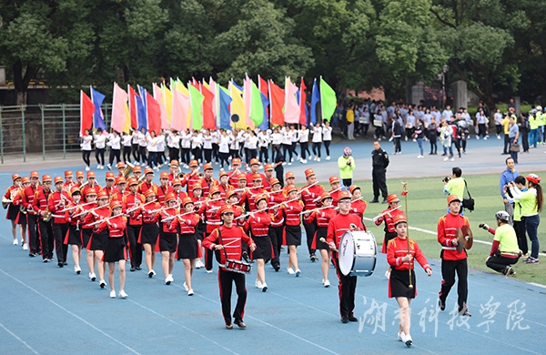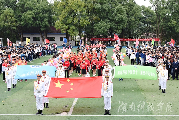 伴随着激昂慷慨的运动员进行曲,运动员代表队和裁判员代表队入场。校国旗队员昂首挺胸、精神抖擞,护拥着国旗、校旗和会旗入场,他们迈着整齐而有力的步伐,阔步前行。热情似火的管乐方阵,伴随着欢乐而轻快的曲子步入会场,各个学院及教职工代表队相继步入会场,他们迈着整齐的步伐,雄赳赳、气昂昂地走过主席台,展现了科院人德才兼备自强不息的精神风貌。