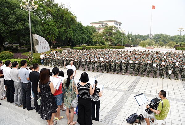 正在中心文化广场参加军训的新生深受感染,也纷纷加入合唱团的队伍中来。“肩负时代重托,胸怀青春信念。群英荟萃在潇湘,校园永远永远是春天……”传媒学院广电1601班郭子冉同学被校园放歌深深吸引住了,“校园歌声飞扬,师生动情歌唱,这样美妙的画面让我们对丰富多彩的校园生活更增添了一份憧憬。”