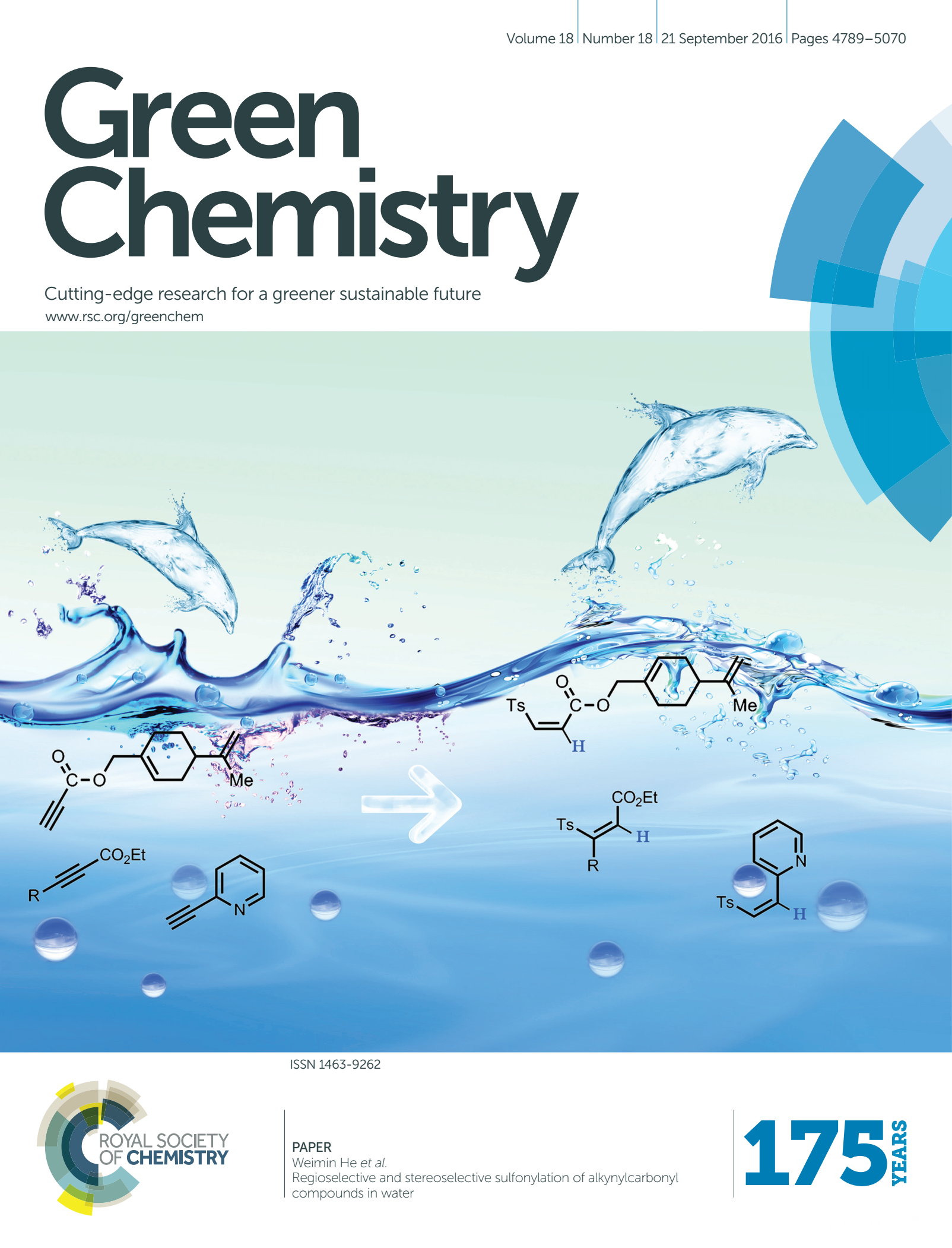 本网讯 近日,伟德官网化学与生物工程学院李文艺博士以第一作者身份,在英国皇家化学会高端SCI学术期刊Green Chemistry上发表封面论文,该论文是由伟德官网作为唯一研究单位独立完成,论文题为“Regioselective and Stereoselective Sulfonylation of Alkynylcarbonyl Compounds In Water”。