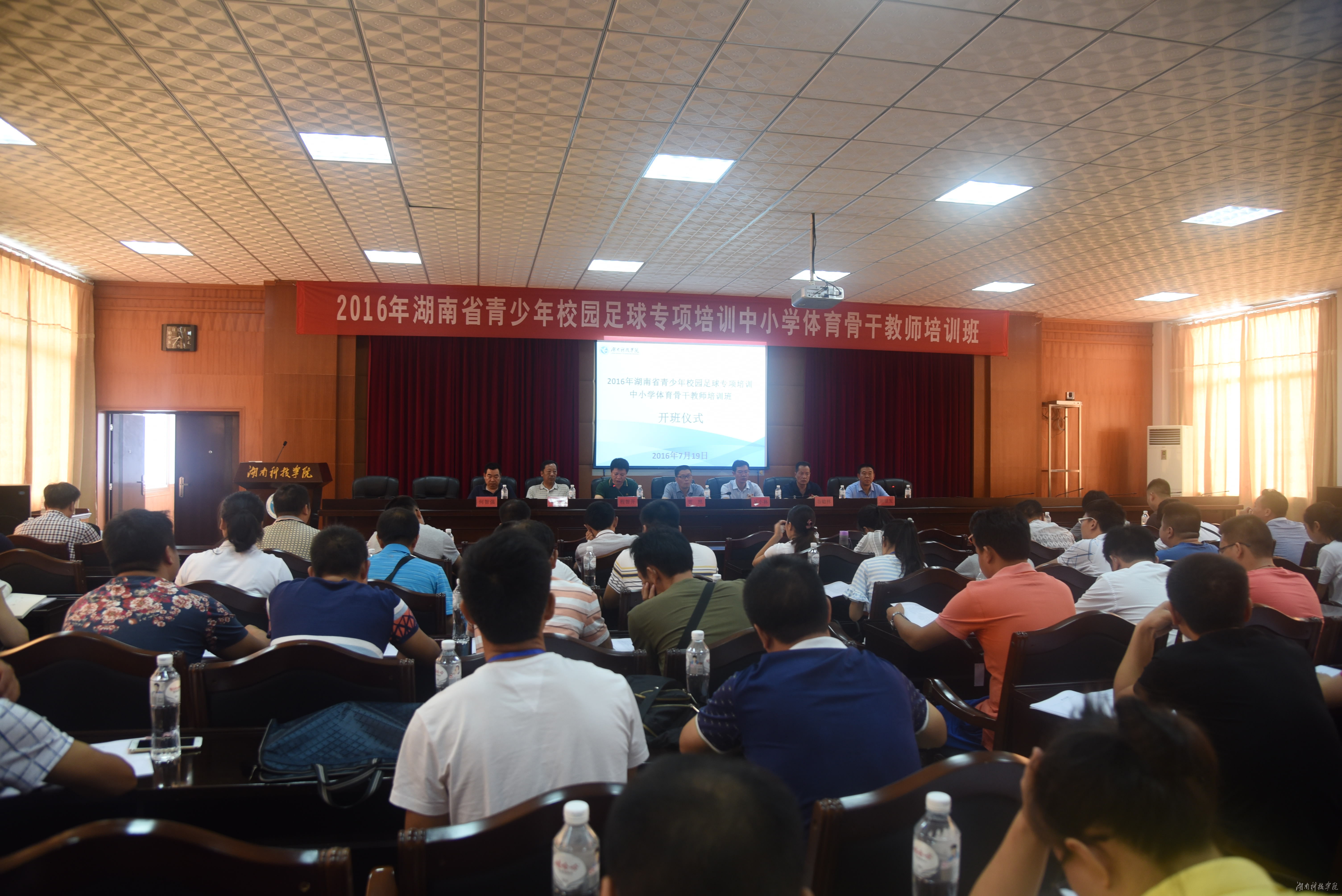 本网讯(通讯员 刘国华) 7月19日,2016年湖南省青少年校园足球专项培训中小学体育骨干教师培训班在伟德官网开班。湖南省教育厅体卫艺处副处长贺照,副校长吴小林、程智开出席开班仪式。来自永州、郴州的60多名中小学体育骨干教师参加为期近半个月的校园足球专项培训。