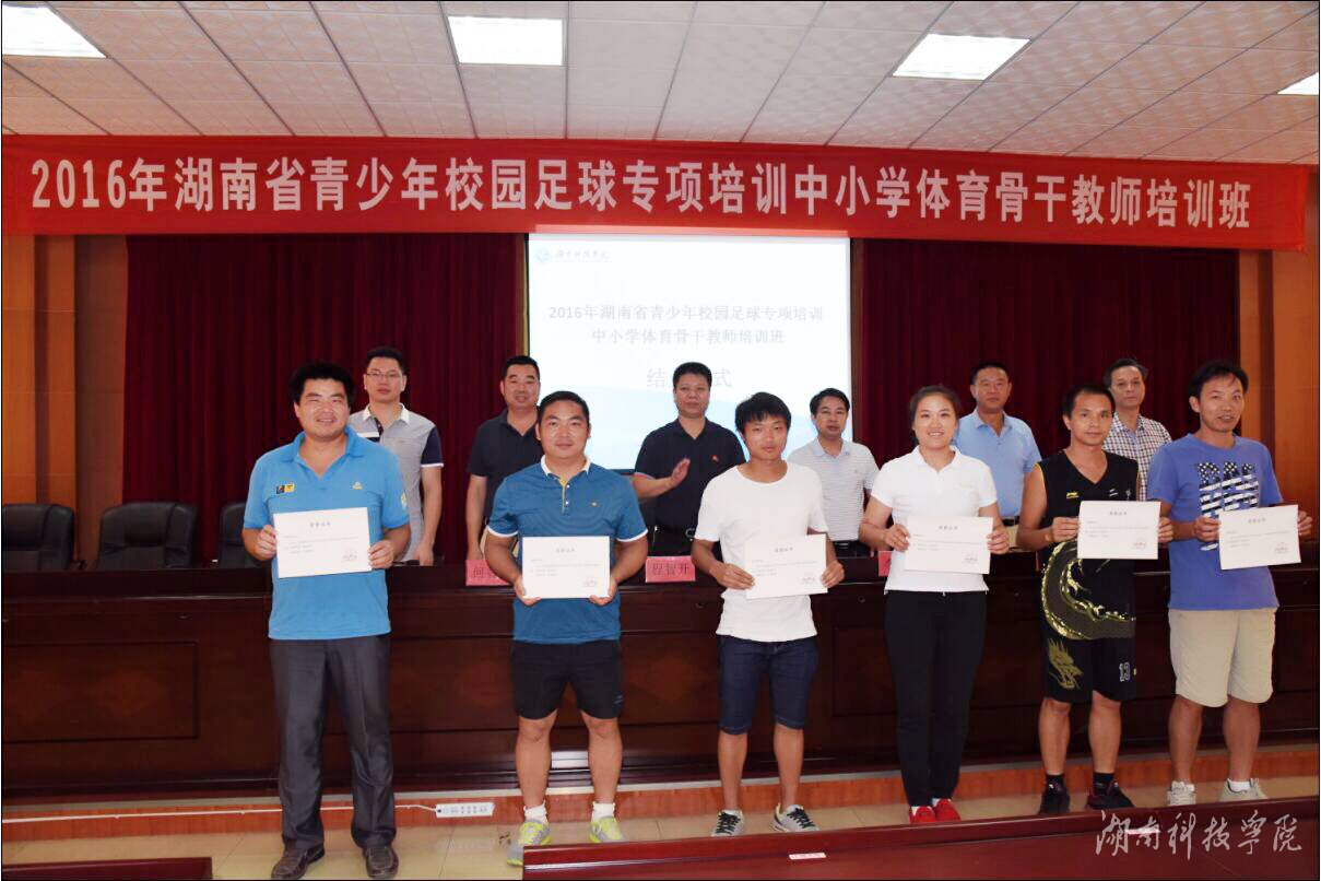 本网讯(通讯员 刘国华) 7月31日上午,为期14天的2016年湖南省青少年校园足球专项培训中小学体育骨干教师培训班圆满结束。副校长李常健、程智开出席结业仪式,并为优秀学员颁发荣誉证书。