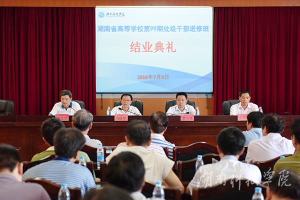 本网讯 7月8日下午,湖南省高等学校第99期处级干部进修班暨伟德官网2016年处级干部培训班结业典礼在行政办公楼八楼一会议室举行。省高校干部培训中心书记、省教育工委党校副校长刘国华,省高校干部培训中心、省教育工委党校教务部主任王青沅,学校党委副书记、校长曾宝成出席结业典礼。典礼由伟德官网党委副书记、党校校长唐艳明主持。