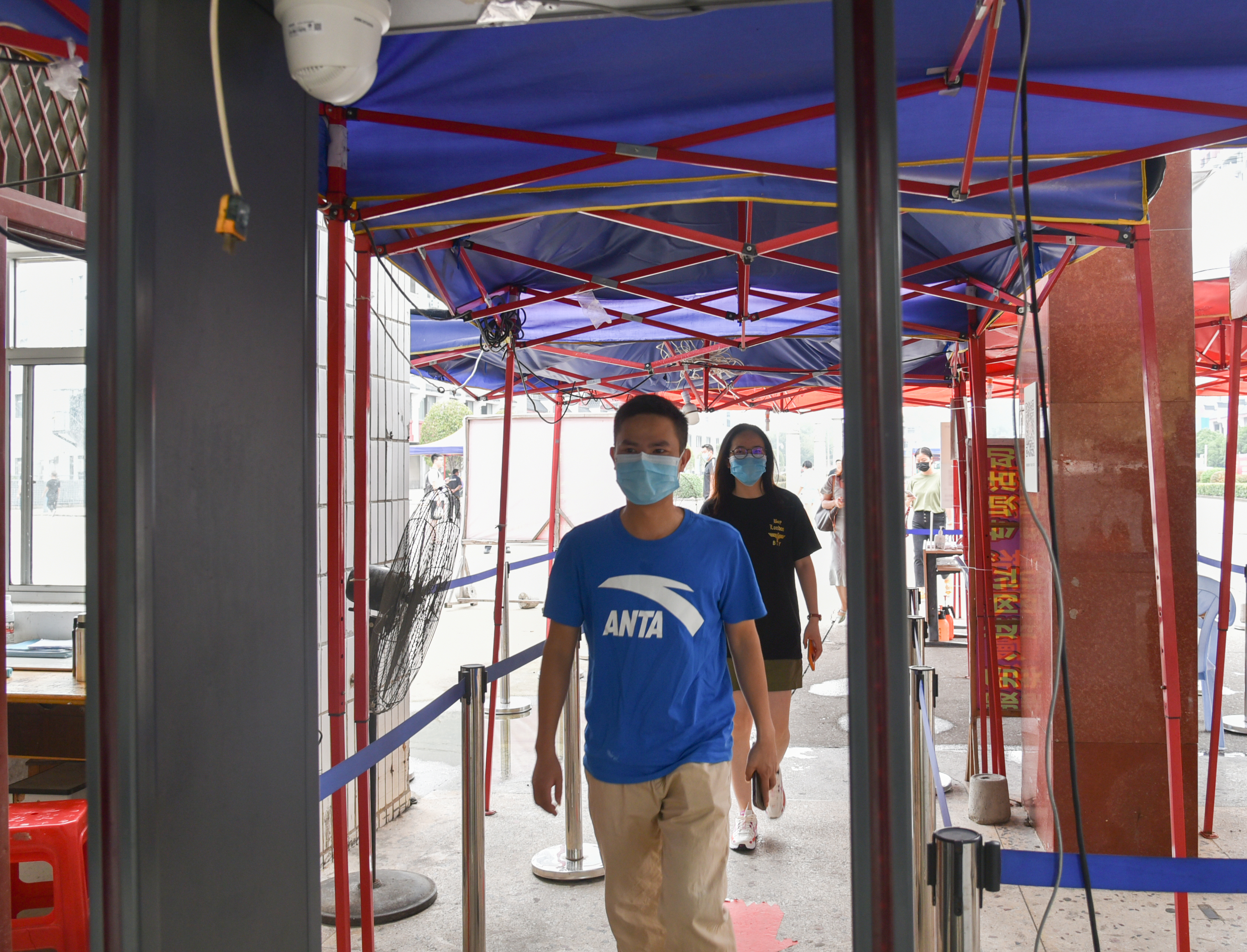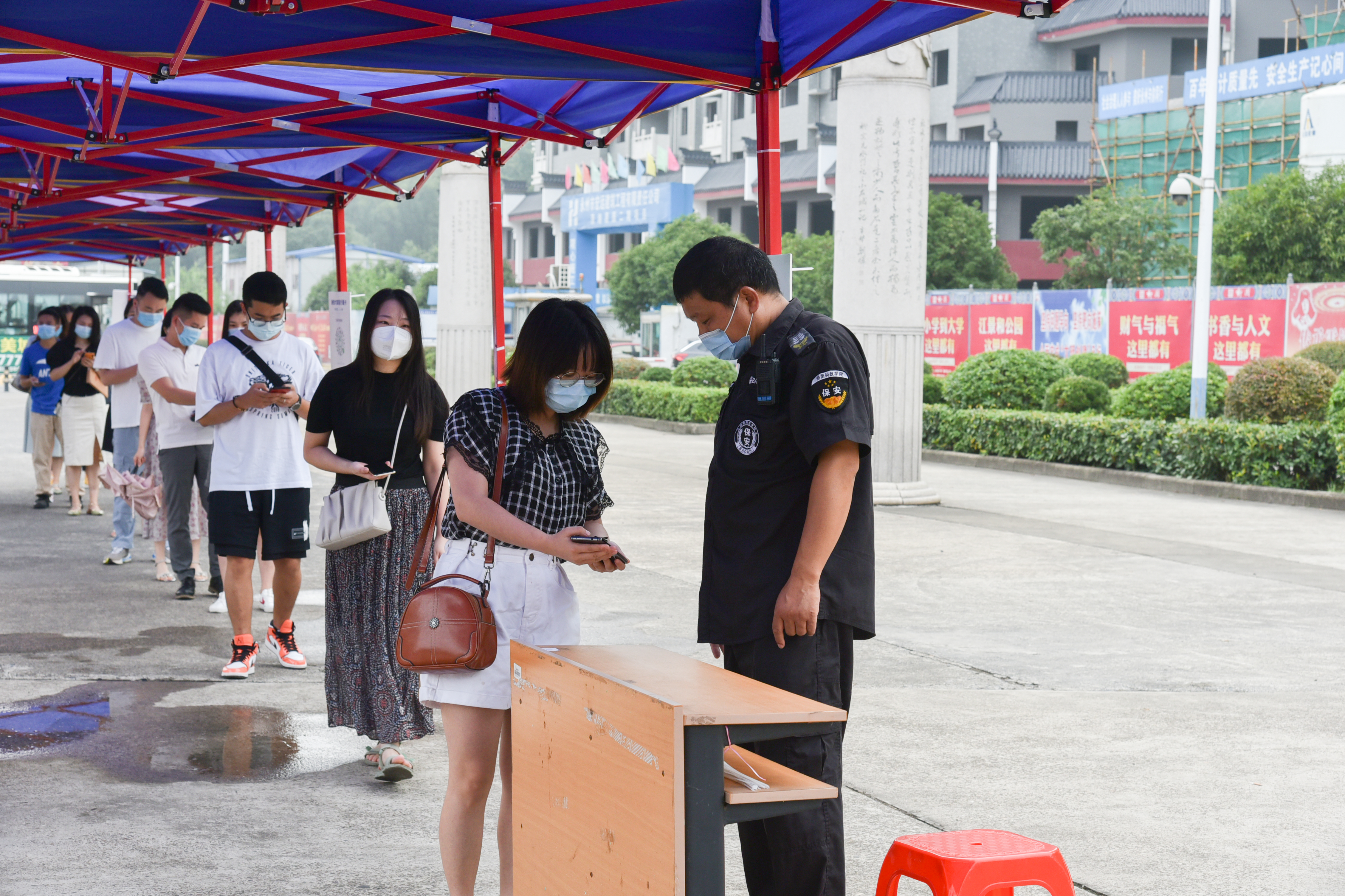 演练中,“返校学生”佩戴口罩按指示标识排队等候进校,每人间隔1.5米。经值班工作人员引导到“入校通道”, 接受健康码核验,显示为绿色且无中高风险地区旅居史的学生,即可至东大门体温监测区进行体温检测,体温正常者可有序进校。如中高风险地区旅居史的学生,还需出示开学前7天内的核酸检测健康报告或相关的健康材料。