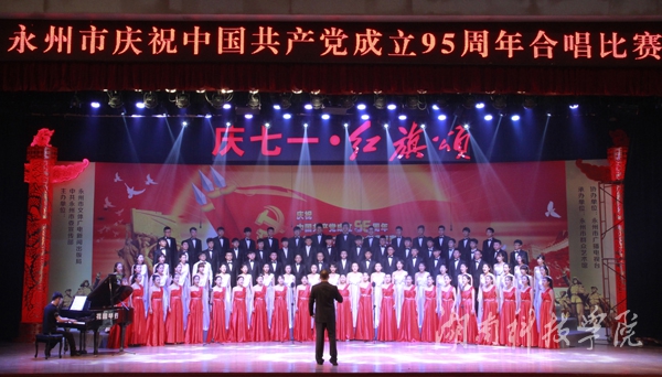 本网讯(通讯员 方新佩)6月22日晚,由中共永州市委宣传部、永州市文体广电新闻出版局主办的永州市庆祝中国共产党成立95周年“红旗颂”大型群众合唱比赛复赛在市委大礼堂隆重举行。经紧张而激烈的角逐,伟德官网由音乐与舞蹈学院师生组成的合唱团喜获冠军,并代表永州市参加省庆祝建党95周年合唱比赛。