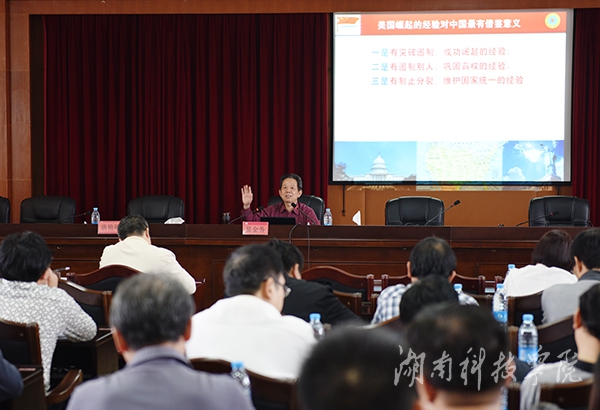 本网讯(记者 张婉静 摄影 何帅文)5月24日下午,国防科技大学教授易金务少将为处干班学员作题为“当前大国关系与我国海洋安全”的专题讲座。讲座由党委副书记唐艳明主持。