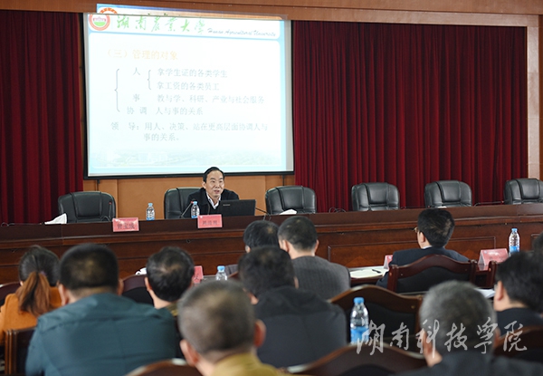 本网讯(记者  张婉静 摄影 何帅文)4月9日下午,湖南农业大学党委书记周清明以“高校管理与发展趋势”为主题给处干班学员授课。校长曾宝成主持。