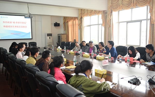 本网讯(实习记者 刘献 摄影 何帅文)4月6日下午,美国欣欣教育基金会理事、“杨隆祜·李绍姒奖学基金”主席杨盛成在湖南省外侨办侨政处副处长赵三元一行的陪同下来校,与龙夏萍等八名受助学子面对面交流。