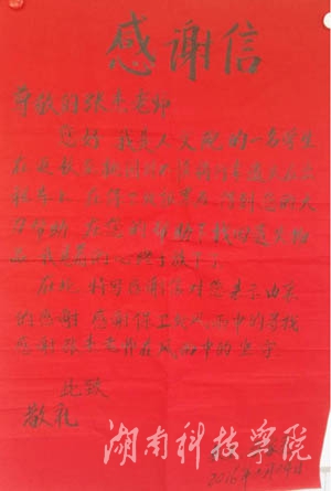 本网讯(通讯员 郑欢)“太谢谢你们帮我找回行李...”2月29日,人文与社会科学学院学生马家亮向保卫处送来一封感谢信,感谢保卫处的值班人员不畏风雨为其找回行李,为全校师生安全财物保驾护航。