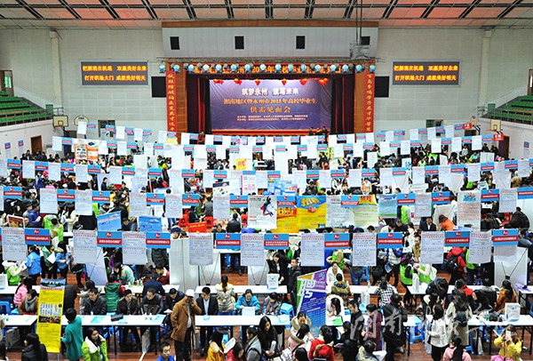 本网讯(记者 刘忠奇 实习记者 杨光月 张云芳)12月12日,湘南地区暨永州市2015年高校毕业生供需见面会在校体育馆隆重举行。8000人次前往招聘现场,认真在前来的262家单位里“找婆家”,近1200名毕业生与用人单位初步达成就业意向。