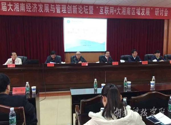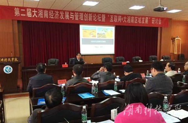 本网讯(记者 裴滢 实习记者 刘梦雅 张云芳 邓肖华 肖浪 尹文怡)11月14日,第二届大湘南经济发展与管理创新论坛暨“互联网+大湘南区域发展”研讨会在伟德官网举行。校党委书记陈弘出席并致辞,副校长宋宏福主持。共有来自各高校30余名专家学者及企业家代表参加研讨。
