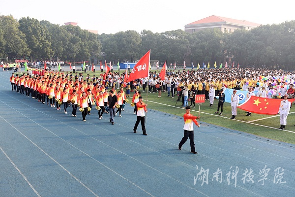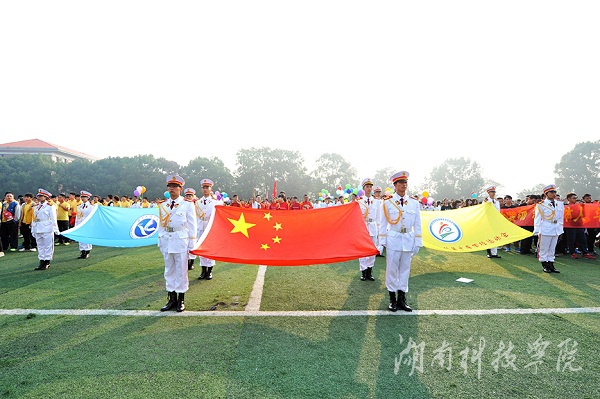 伴随着激昂的运动员进行曲,校国旗队员昂首挺胸、精神抖擞,护拥着国旗、校旗和会旗入场;乐队、彩旗队、工程队、鲜花队、彩球队的同学们张扬活力,阔步昂扬,其中,充满青春气息的鲜花队方阵由56名同学组成,代表着我国56个民族,他们手拿色彩斑斓的鲜花,身穿不同的民族服饰,脸上洋溢着灿烂笑容,弘扬青春正能量;各学院代表以整齐的列队,各具特色的方阵彰显朝气蓬勃的青春活力。随着国旗、校旗和会旗的缓缓升起,激昂的歌声也回荡在学校上空,将“德才兼备 自强不息”的精神传达到每一名科院人的心中。