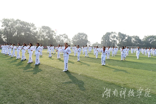 随即21响礼炮响彻云霄,五彩斑斓的气球放飞天空,全场欢声雷动。身穿白色道服的跆拳道表演队伴随气势恢宏的音乐跑进会场,他们充满活力与激情,每招每势都散发出青春的气息,众人摆出的五环图案,继而随着音乐转为柔和而分化为太极方阵,再随着音乐气势高涨迅速摆成校徽图案,最后以炫酷踢木板结束表演。就在众人回味时,啦啦操表演队员们手持色彩斑斓的彩球,伴着欢快的节奏进入会场,他们动作整齐划一,手持花球奋力挥舞,活力无限,动感十足,为运动健儿们呐喊助威。