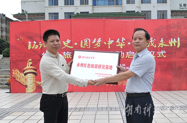 副校长程智开代表学校接收“永州红色旅游研究基地”牌匾