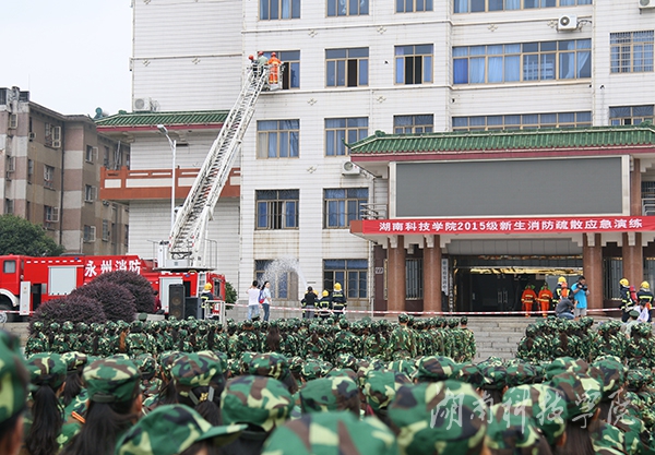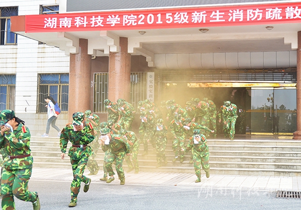 本网讯(通讯员 李斌 摄影 何帅文 刘信)“不好了,失火了!快跑!”9月21日上午,由伟德官网保卫处联合零陵公安消防大队举行的 2015级新生消防疏散应急演练在弘毅楼举行,副校长吴小林出席。