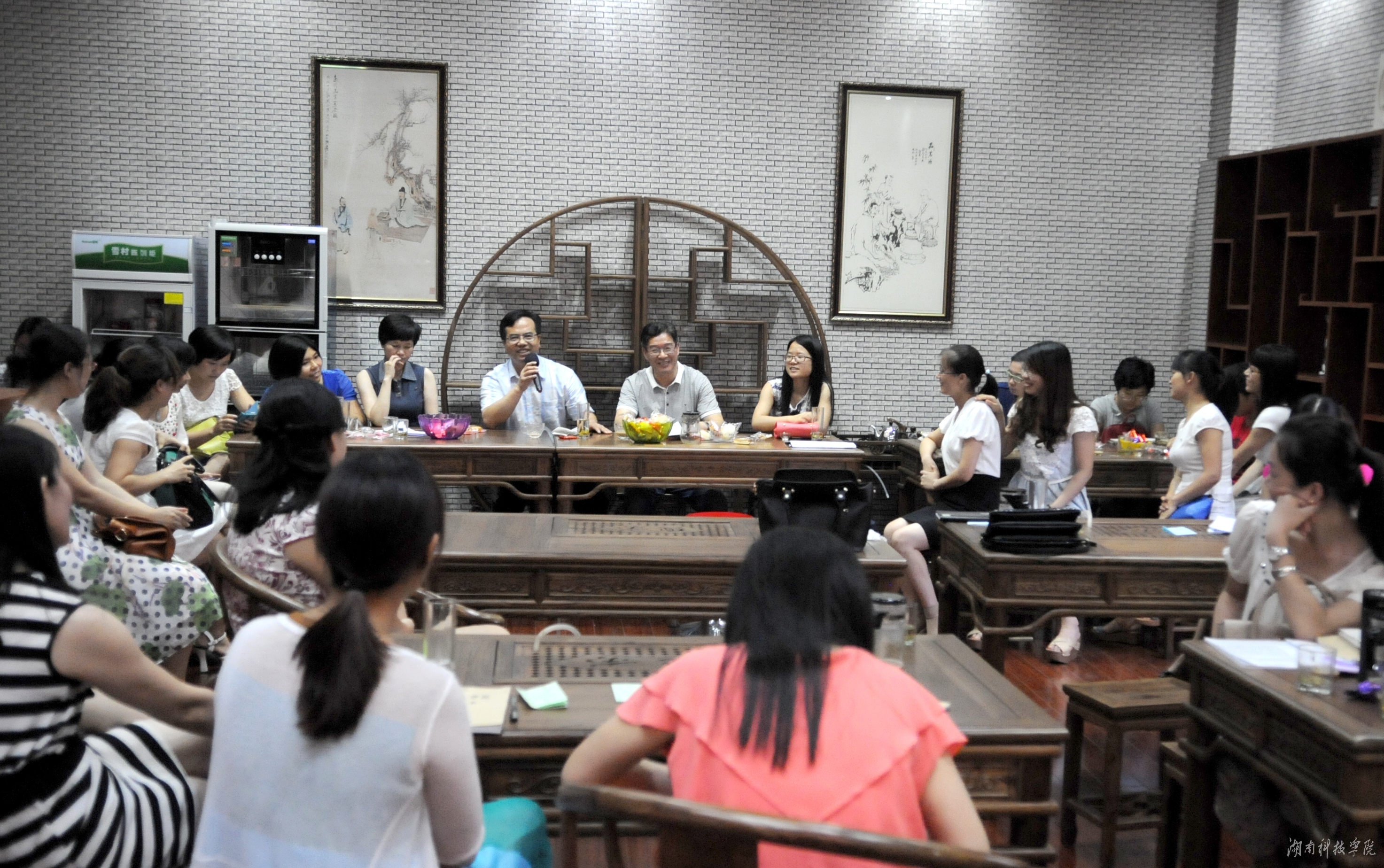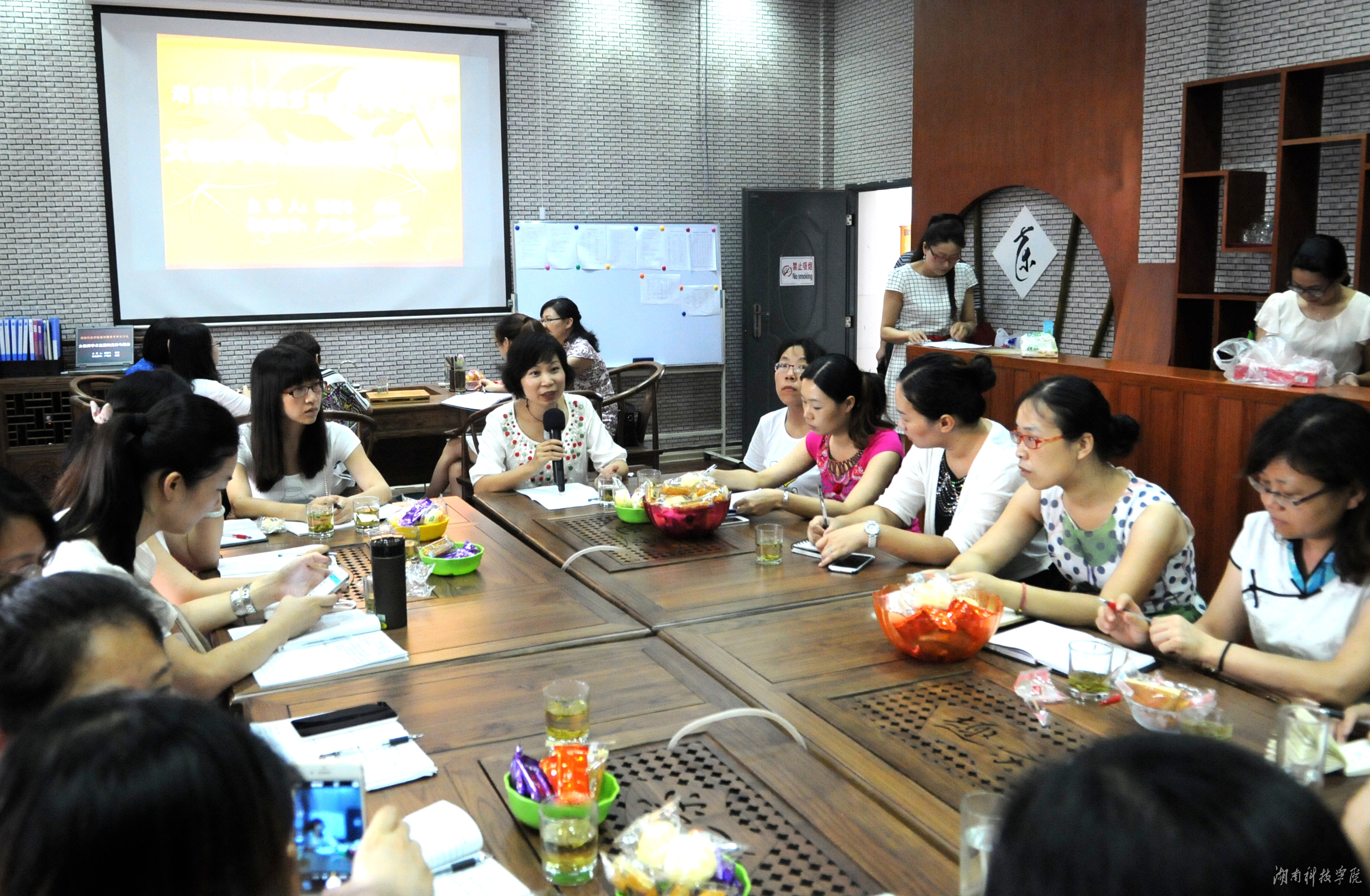 沙龙设有学术分享和学术体验两个环节。学术分享由谢筱冬教授主讲。谢筱冬首先阐述了女教师特殊身份,相对于男教师,女教师需要更多时间照顾家庭;谢筱冬给女教师们讲述了自己从助教到教授所面临的职称评定、工作压力、家庭压力,她建议女教师们明确科研目标,不断严格要求自己,重视学术沉淀,拥有学术自信,合理期望自我,善于发现问题,专注做好每一件事情。体验式活动在卢桂珍教授组织下有序开展。女教师们积极参与热身活动“青蛙跳水”,茶艺室充满欢声笑语,教师姐妹们默契极佳;在准确定位环节,女教师们则畅所欲言,结合工作与生活实际进行自我定位; “自我探索”环节中,女教师们以学院为单位分享自己所面临的问题与困惑。 “奇思妙想”环节,大家齐心协力,互帮互助,发挥“最强大脑”,答疑解惑。