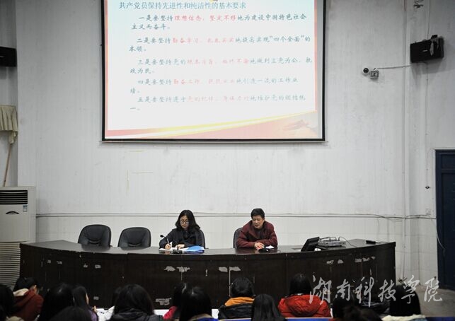 唐艳明以弘扬党的优良传统为主线,对党的先进性和纯洁性的内容进行全面深入的讲解,从民族、国家、个人三个方面阐述了保持党的先进性和纯洁性的重要性与紧迫性。他说:“思想是行为的先导,决定着人的价值选择,因此保持思想的先进性和纯洁性至关重要。”唐艳明还带领学员回顾共产党在新民主时期、社会主义革命、社会主义建设发展时期始终保持党的先进性和纯洁性所取得的成果,并结合新时期党和国家各项工作关键环节“四个全面”指出永葆党的先进性和纯洁性的必要性,引导和教育学生树立正确的世界观、人生观、价值观,紧跟时代的潮流,把握时代的脉搏,为校园发展建设贡献自己的力量。