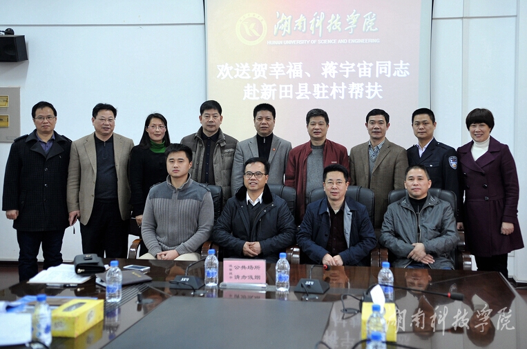 本网讯 (实习记者 段坤 摄影 秦峰)4月8日上午,由贺幸福、蒋宇宙两位同志组成的驻村帮扶工作队,将奔赴新田县冷水井乡潮水铺村开展为期三年的驻村帮扶工作。校党委书记陈弘、校长曾宝成、党委副书记唐艳明、副校长吴小林、副校长程智开和相关部门负责人热情欢送两位驻村干部。
