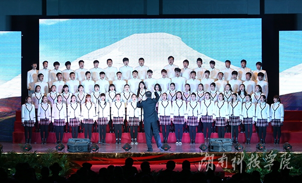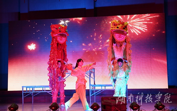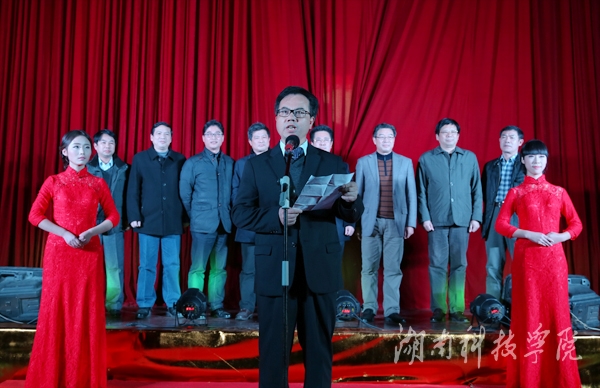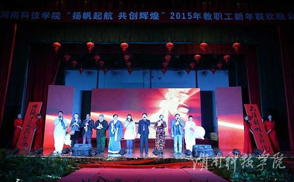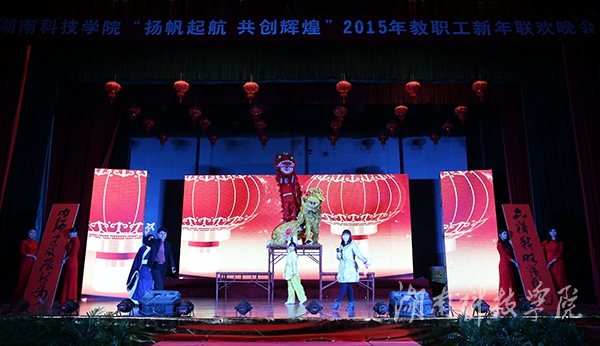 整场晚会的节目安排紧凑活泼、生动有序,教职工们载歌载舞,喜迎新年。晚会以中国的传统习俗舞狮——《新年好》开场,舞狮者的动作变幻灵活,时而腾跃,时而登高,给晚会増添了一丝喜庆和热闹。舞狮期间,伟德官网唐幼铎老师现场挥笔,奉送出一幅豪迈大气、充满美好祝愿的对联:“六精战略强科院,内涵建设展新姿。”紧随其后,伟德官网师生纷纷送上对新年的祝福和对学校发展的美好愿望,其中包括在伟德官网任教的来自印度的Rajesh、Summerl和来自美国的Michael。“群英荟萃在潇湘,潇湘为我展新颜”,一曲《潇湘之歌》道尽科院师生的心声,由李伟老师带领的音乐系合唱团以其恢宏的气势带动了全场的气氛。