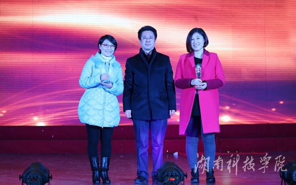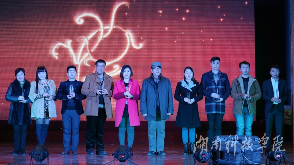 晚会还对部分优秀教师进行了颁奖。老教师林松年为湖南省第三次教育科学研究优秀成果奖一等奖获得者宋振文,湖南省第三届高校辅导员职业能力竞赛本科组复赛、决赛三等奖获得者段元梅、周闻名、张芳以及湖南省第四届高校艺术教育科研论文评审一等奖获得者冯建华、李伟、邢磊、蒋娟全等教师进行了颁奖;老教师陶瑛为在国家级、省级比赛中荣获优秀指导者称号的黄华丽、蒋娟全、赵庚妹、陆仁强、张亚南、陈彦卿、夏炳梅、胡玲梅、唐彦歆、赵湘、赵荣生、黄林华等教师颁奖;校长曾宝成为湖南省普通高校教师课堂教学竞赛一等奖获得者廖海燕、夏炳梅进行了颁奖。