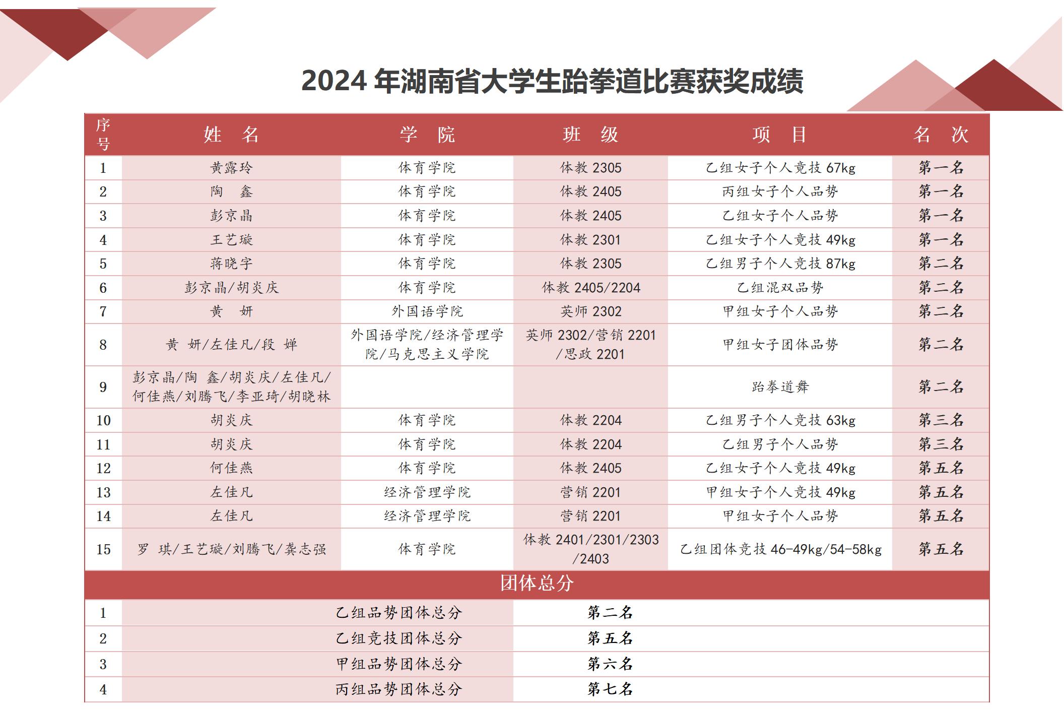 赛场上,伟德官网共派出16名运动员参与了15个项目的角逐,最终斩获4金5银2铜的优异成绩。其中体育学院黄露玲、陶鑫、彭京晶、王艺璇等同学在个人项目中脱颖而出,分别夺得乙组女子个人竞技和品势项目的冠军。团体项目中,伟德官网学子同样表现出色,由外国语学院黄妍、经济与管理学院左佳凡、马克思主义学院段婵等三位同学组成的甲组女子团体品势,凭借默契的配合和精湛的技艺,获得了全省第二名的好成绩。