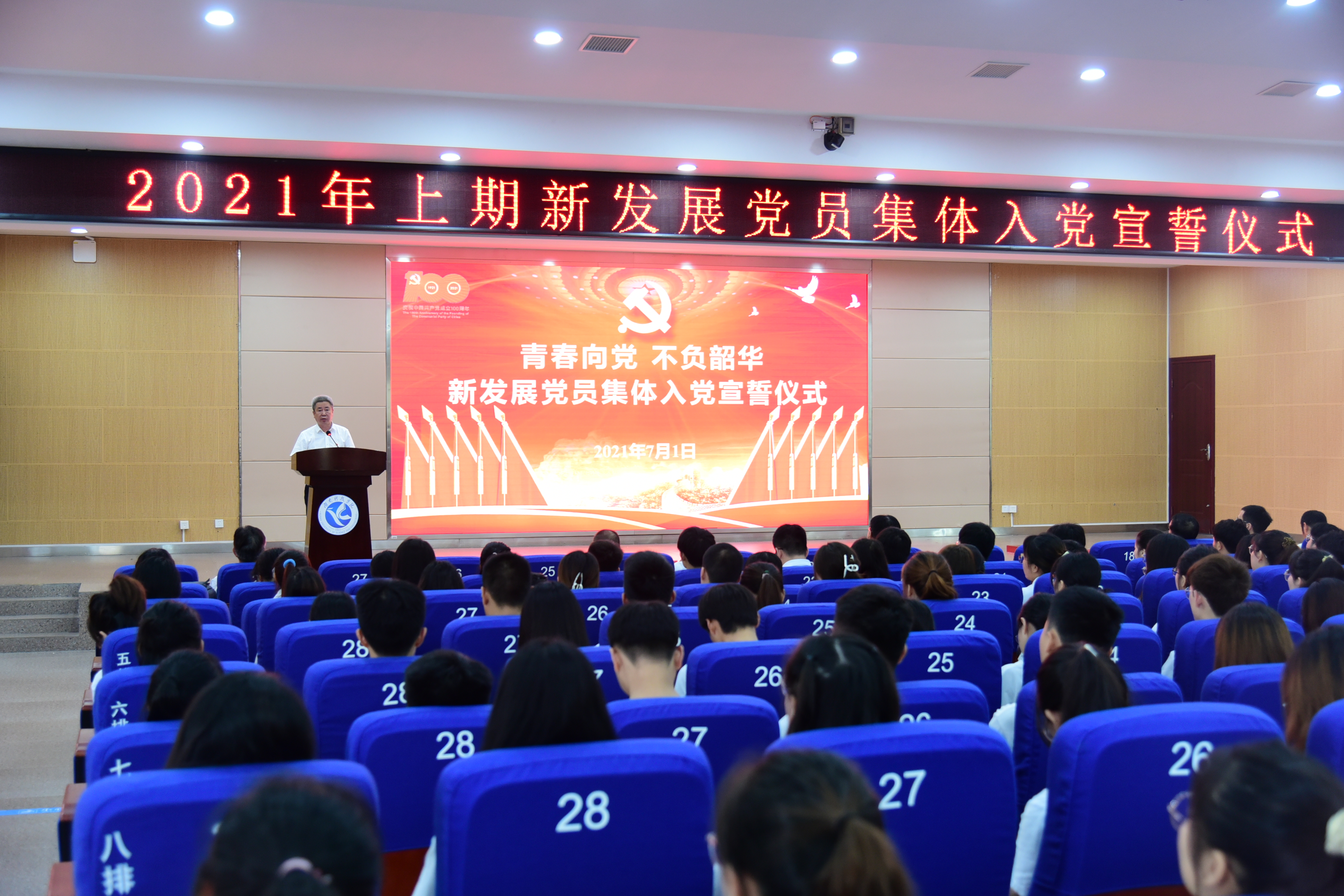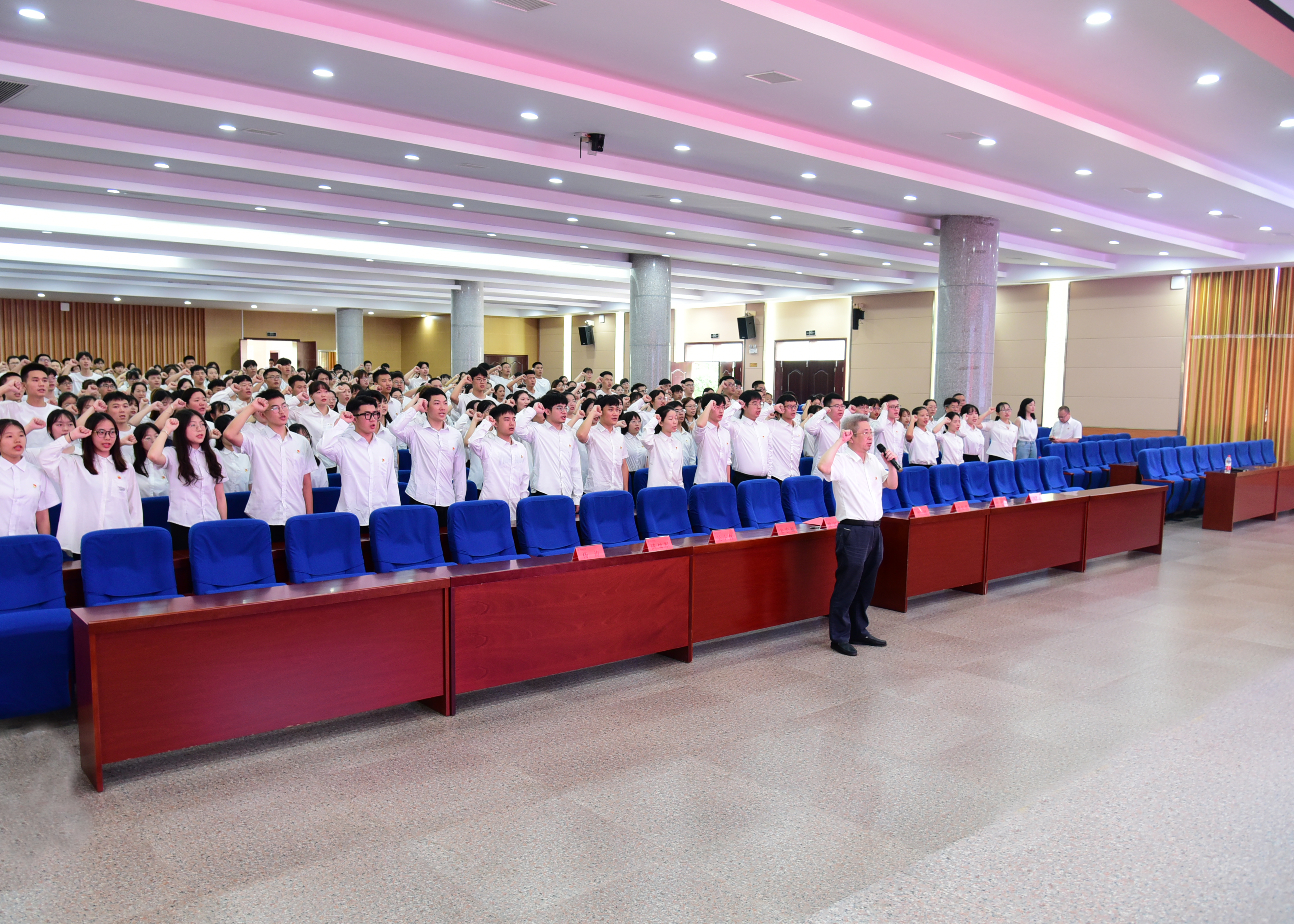 本网讯 “我志愿加入中国共产党,拥护党的纲领,遵守党的章程……为共产主义奋斗终身,随时准备为党和人民牺牲一切,永不叛党!”7月1日,在潇湘大讲堂,伴随入党誓词歌《我宣誓》响起,新入党的335名师生党员面向党旗,由校党委书记曾宝成领誓,举起右拳许下铮铮誓言。