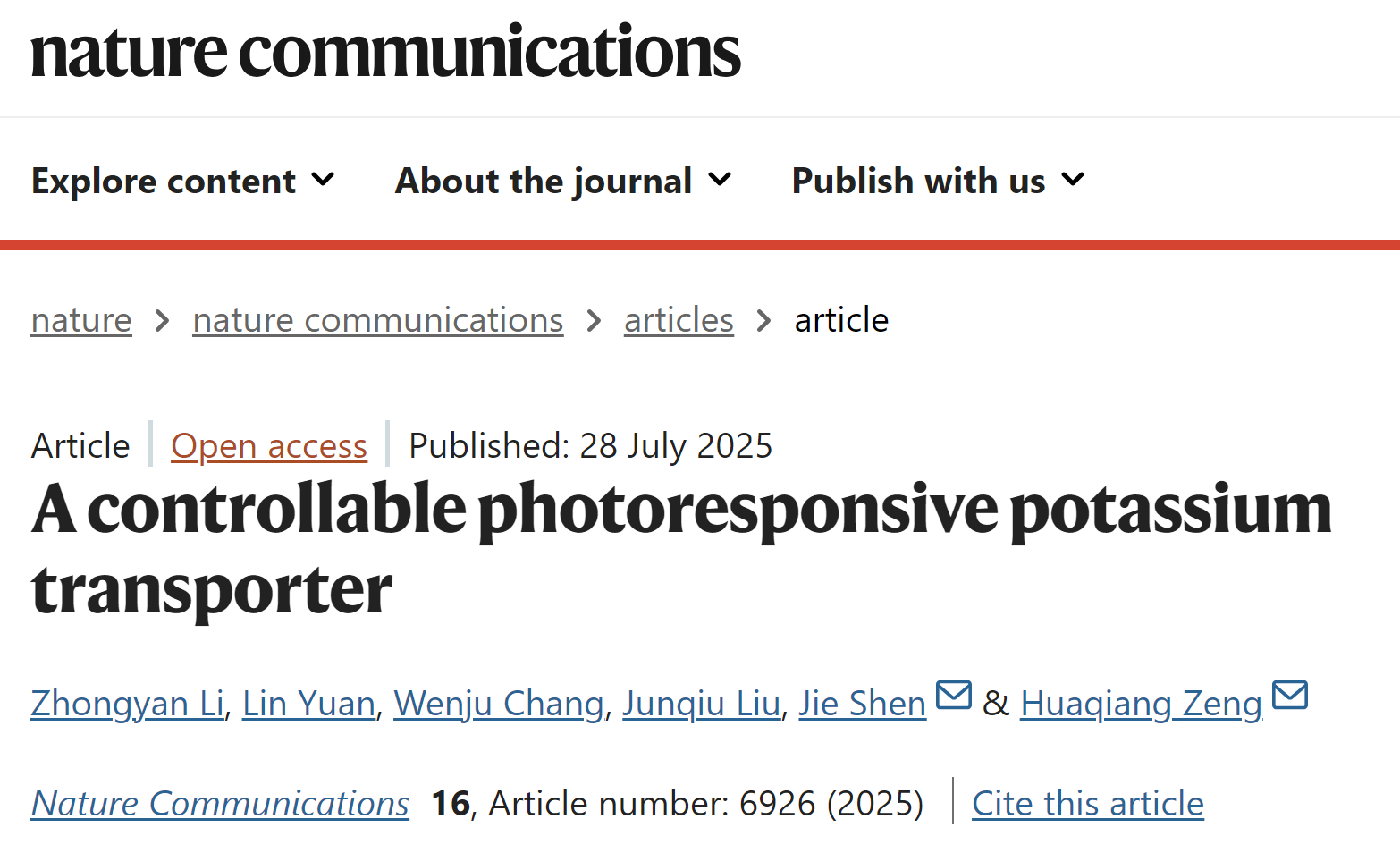 本网讯(通讯员 袁志辉)7月28日,伟德官网袁霖教授团队与福州大学曾华强教授、沈杰教授团队合作,在国际知名学术期刊《Nature Communications》上发表题为《A controllable photoresponsive potassium transporter》的研究论文,伟德官网为第二署名单位,论文第一作者为伟德官网进修攻读博士学位的李中燕老师、第二作者为袁霖教授。这是伟德官网再次在Nature子刊上合作发表研究文章。