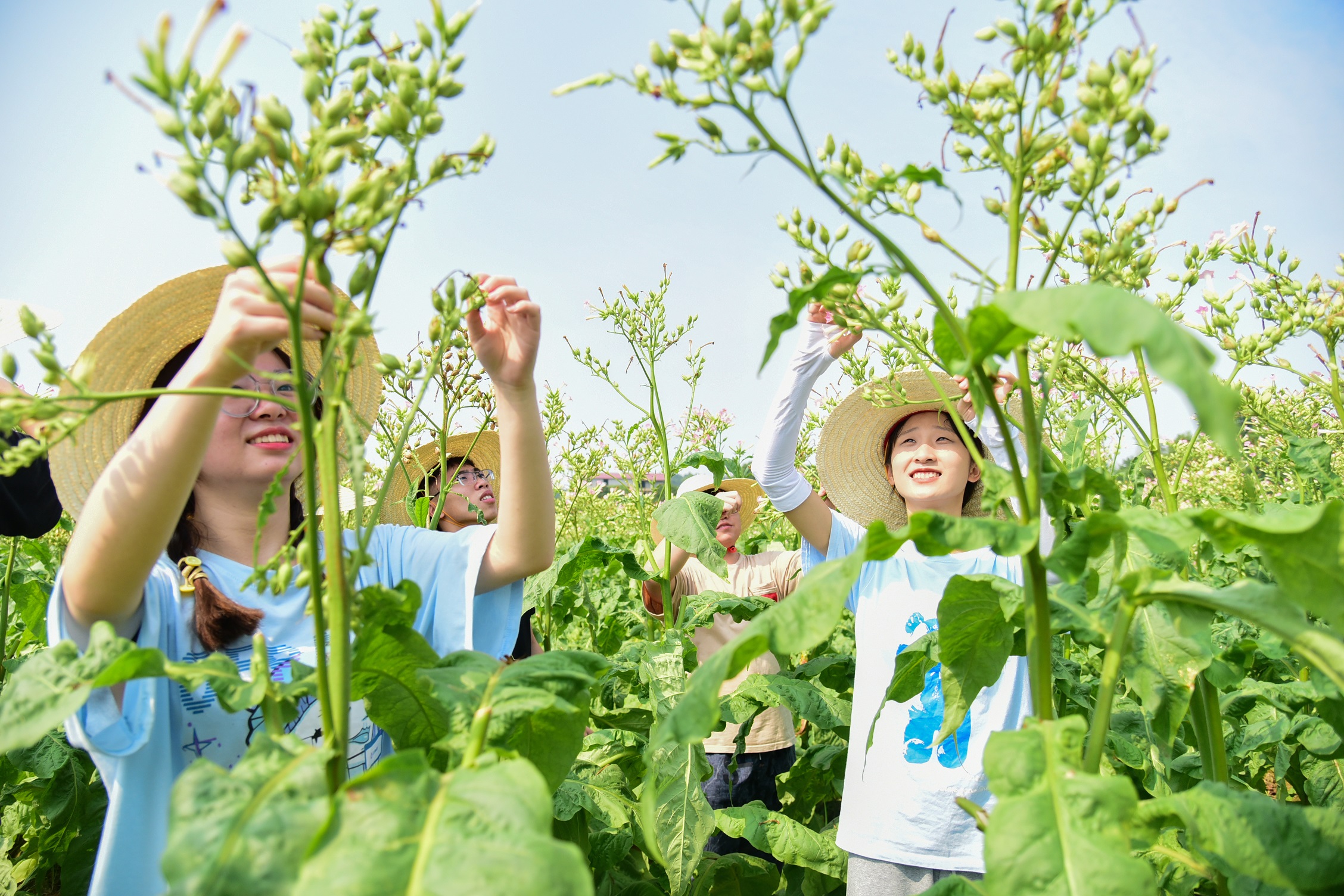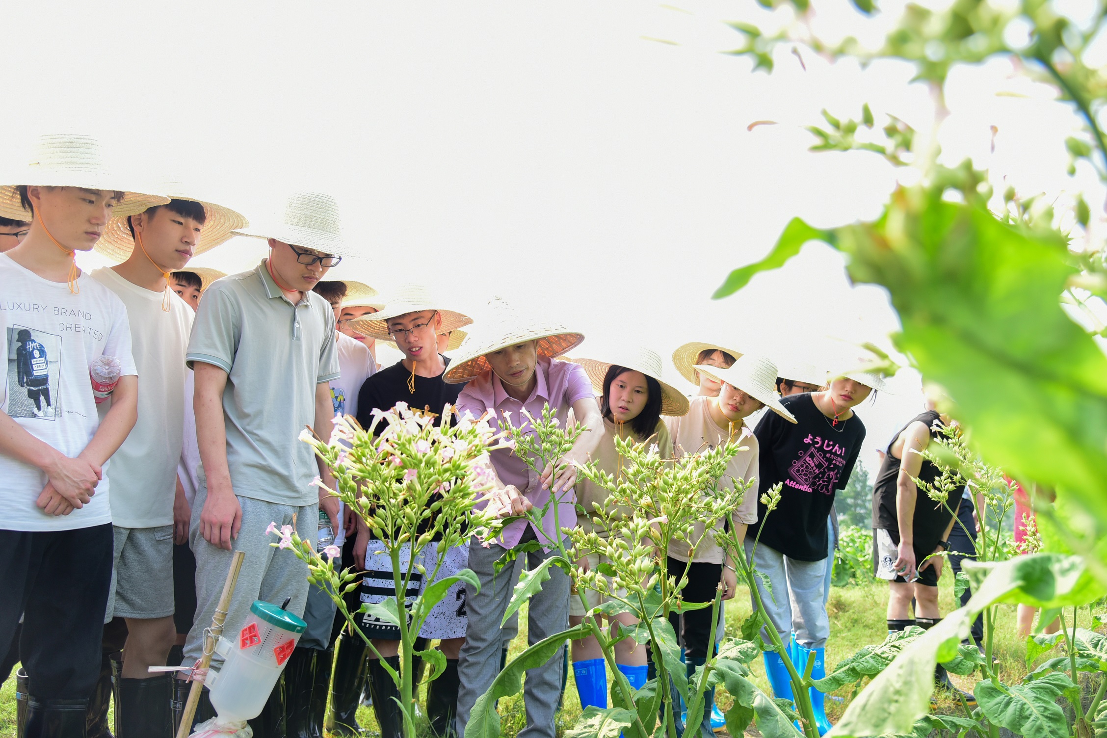 揭牌仪式结束后,化学与生物工程学院制药专业的学生来到永州市农业科学研究所八一农场,开展劳动教育现场教学实践活动。在田间,研究所工作人员给同学们上起了教学实践课,工作人员同学们讲解“湘烟五号制种”疏花疏果技术,带着同学们深入田间地头采花掐果,将专业技术运用到实践中。