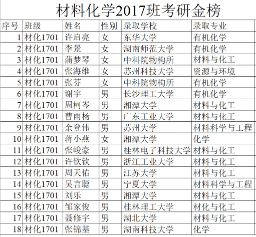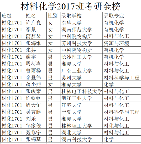 大学四年,他们用拼搏与智慧,书写了一份亮眼的答卷——化学与生物工程学院材料化学1701班共37人,27人参加2021年硕士研究生考试,考研录取人数为18人,6人次考上中国科学院、湖南师范大学、苏州大学等名牌院校,考研录取率高达48.6%,远远超过全国平均考研录取率。