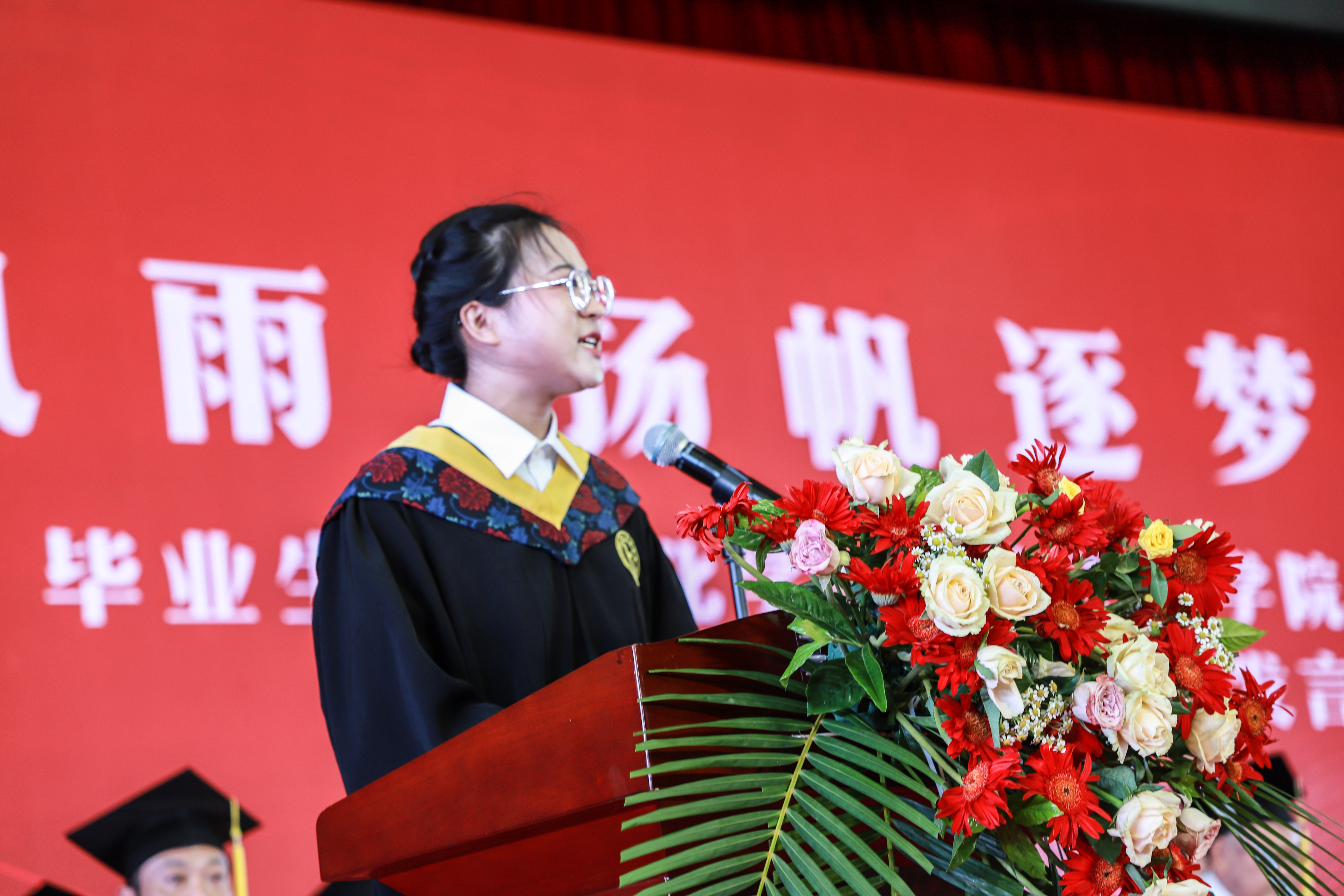 “科院给予我们的财富不仅仅是书本上的专业知识,更是对真善美的执着信仰和由衷热爱。”2023届毕业生、制药1902班彭臻同学代表全体毕业生向学校、老师、家人和朋友表达了最衷心的感谢。她分享了自己在大学四年的美好青春时光和成长收获,呼吁同学们担当起新时代青年的社会责任,在实践中实现自我价值,无畏风雨,扬帆逐梦。