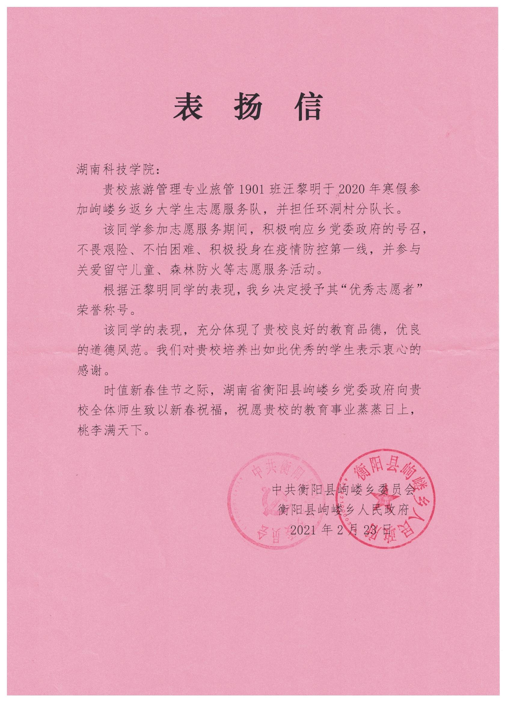 日前,衡阳县岣嵝乡政府寄来表扬信,高度赞扬汪黎明同学不畏艰险、不怕困难,展现了青年大学生的担当与使命。此外,汪黎明同学还在志愿活动中担任了环洞村分队长,因工作成绩出色,荣获“优秀志愿者”荣誉称号。