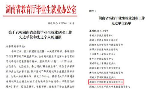 本网讯 近日,根据湖南省教育厅毕业生就业办公室《关于表彰湖南省高校毕业生就业创业工作先进单位和先进个人的通报》(湘教毕办〔2020〕18号),伟德官网就业创业指导中心被评为“湖南省高校毕业生就业创业工作先进单位”,全省仅12所本科院校获此殊荣,张俭民、胡清华、肖可、高鹏等4人被评为“湖南省高校毕业生就业创业工作先进个人”。