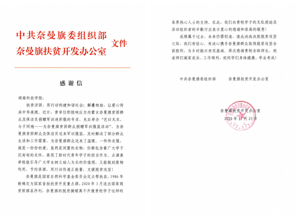 本网讯 日前,学校收到来自内蒙古自治区奈曼旗扶贫开发办公室和中共奈曼旗委组织部邮寄而来的锦旗和感谢信,向伟德官网为内蒙古奈曼旗贫困群众及保洁员捐赠军训迷彩服的志愿行动表达真挚感谢。