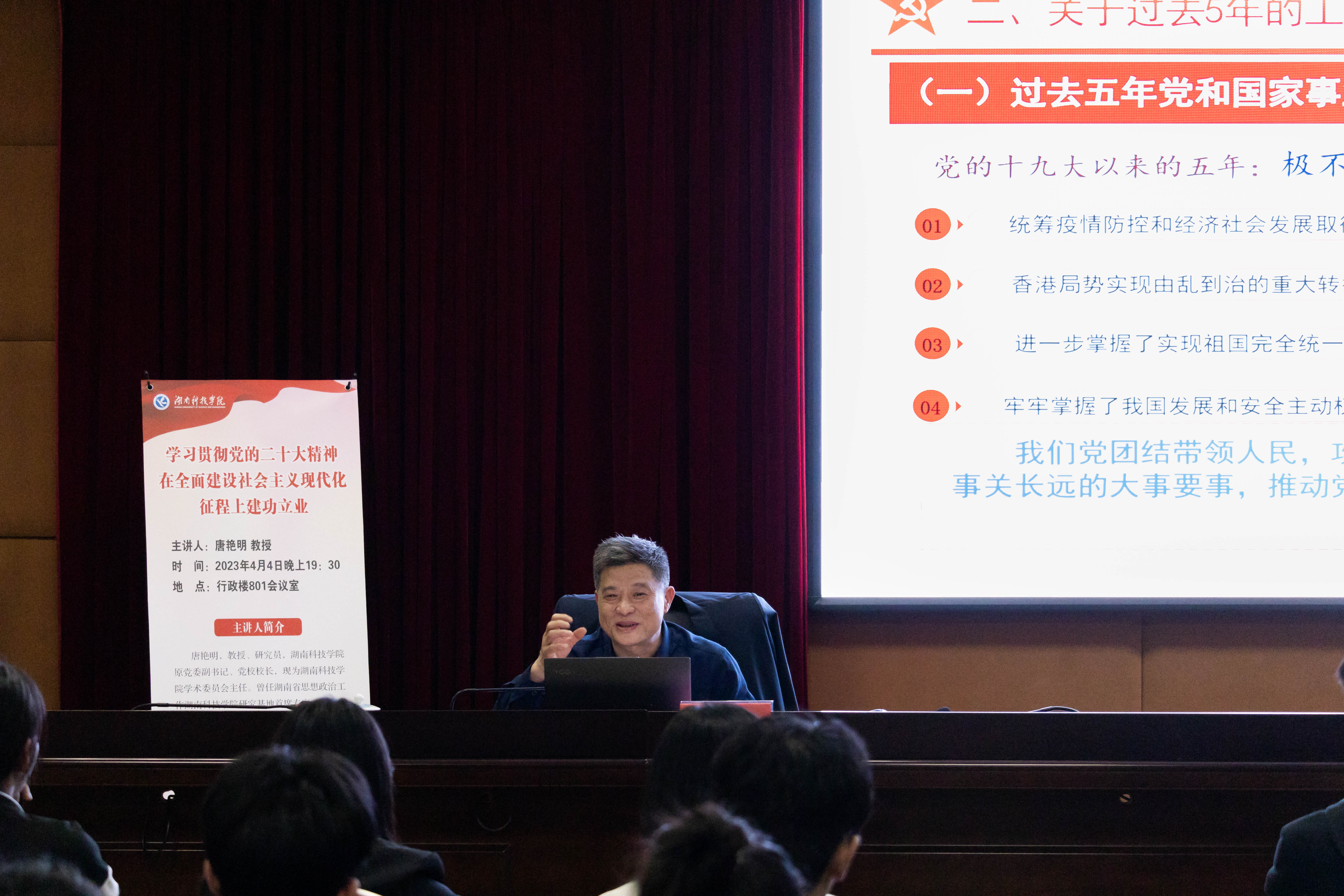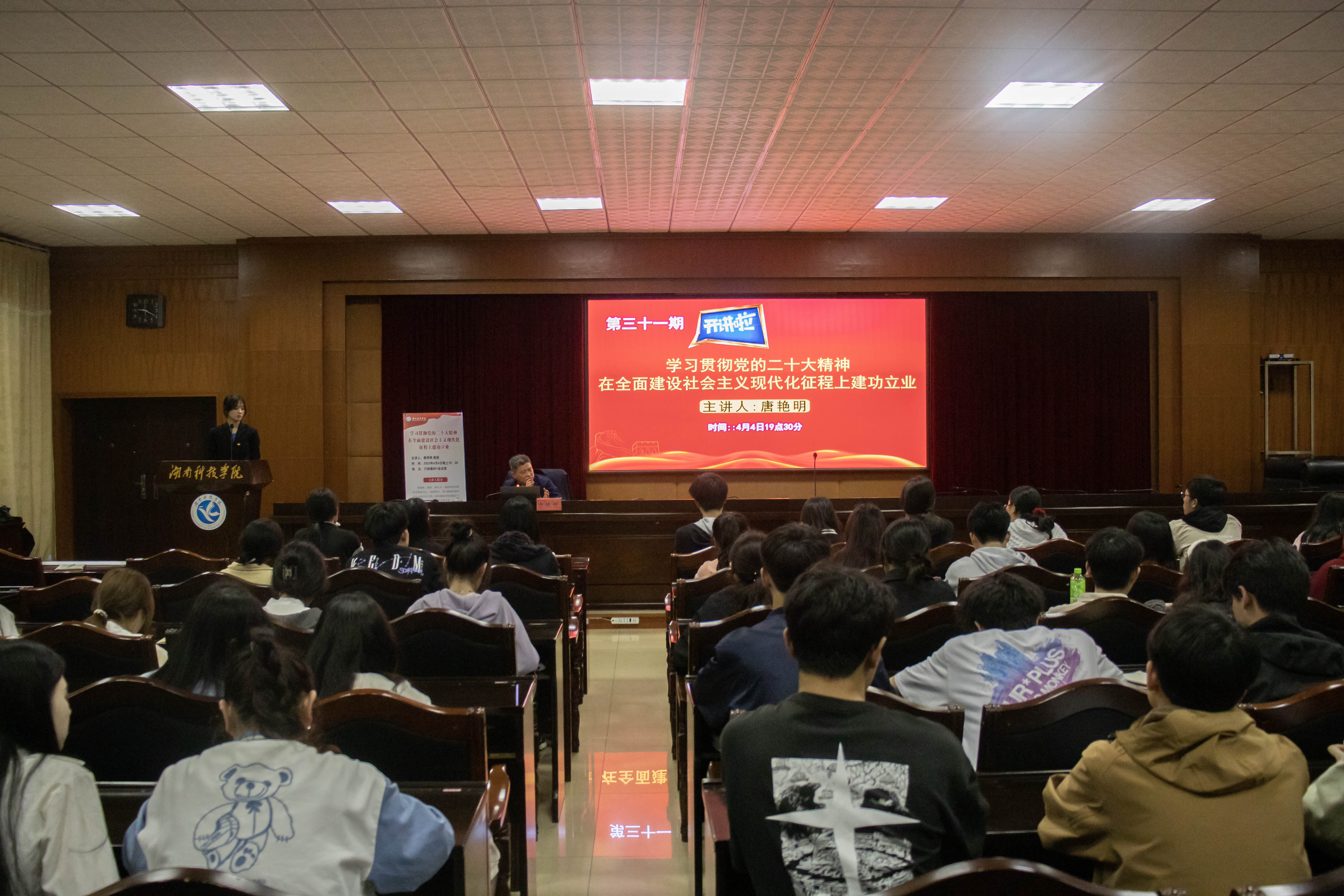 唐艳明教授围绕“学习贯彻党的二十大精神,在全面建设社会主义现代化征程上建功立业”主题,从“一次给大会做思想准备的重要讲话”、“一份作为马克思主义纲领性文献的报告”、“一个体现理论实践制度创新成果的党章” “一场举世关注、充满新征程出发感的见面”、“一届深受人民拥护信赖的中央领导集体”、“一个具有决定性意义的规定”等九个方面为同学们深刻阐释了党的二十大的具体内容与意义,并提出在两个百年交汇节点中,新时代大学生要增强“四个意识”,坚定“四个自信”,做到“两个维护”,捍卫“两个确立”,要全面贯彻习近平新时代中国特色社会主义思想,高举中国特色社会主义伟大旗帜,弘扬伟大建党精神,把个人发展融入到国家复兴大业中去。