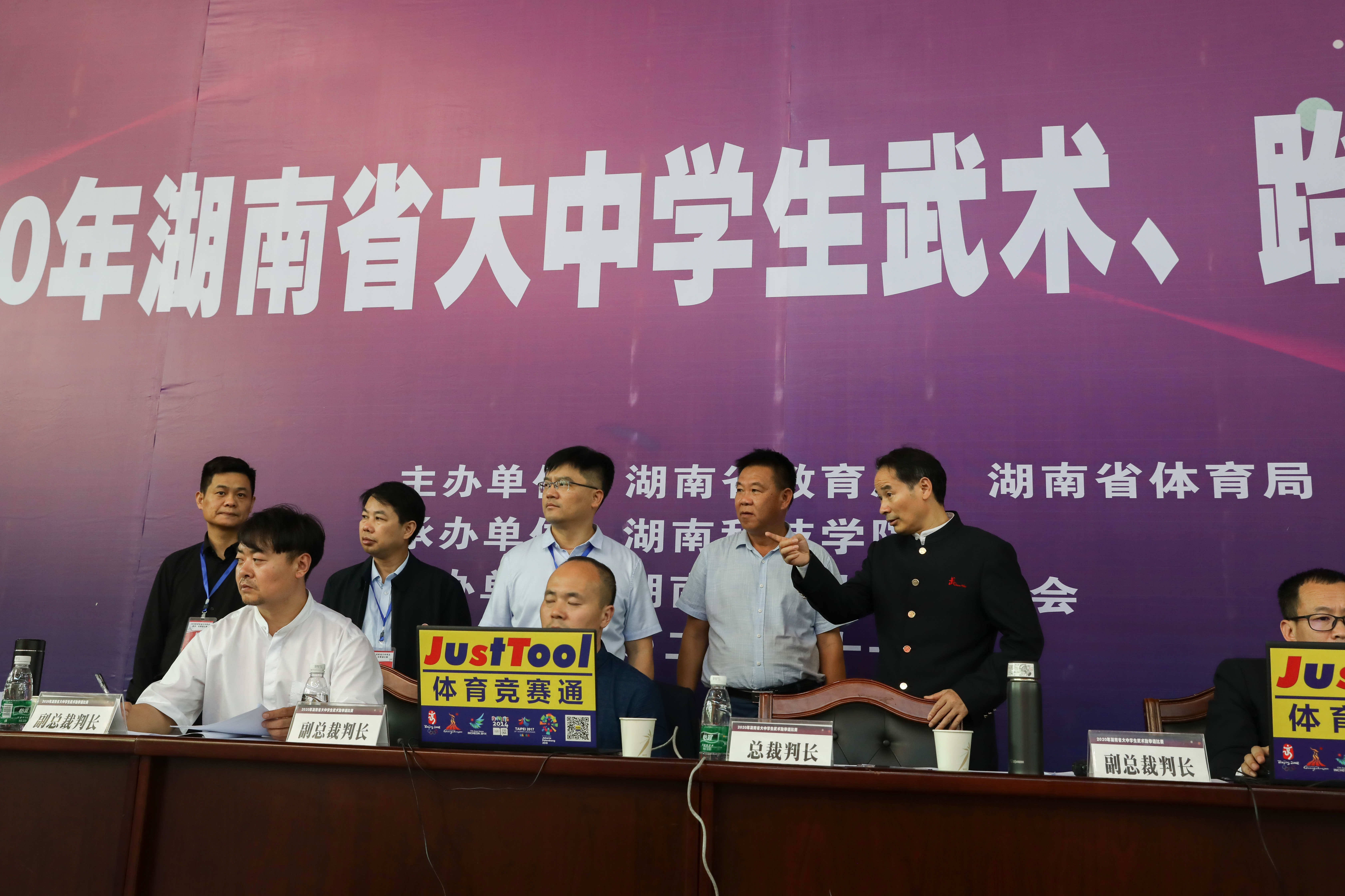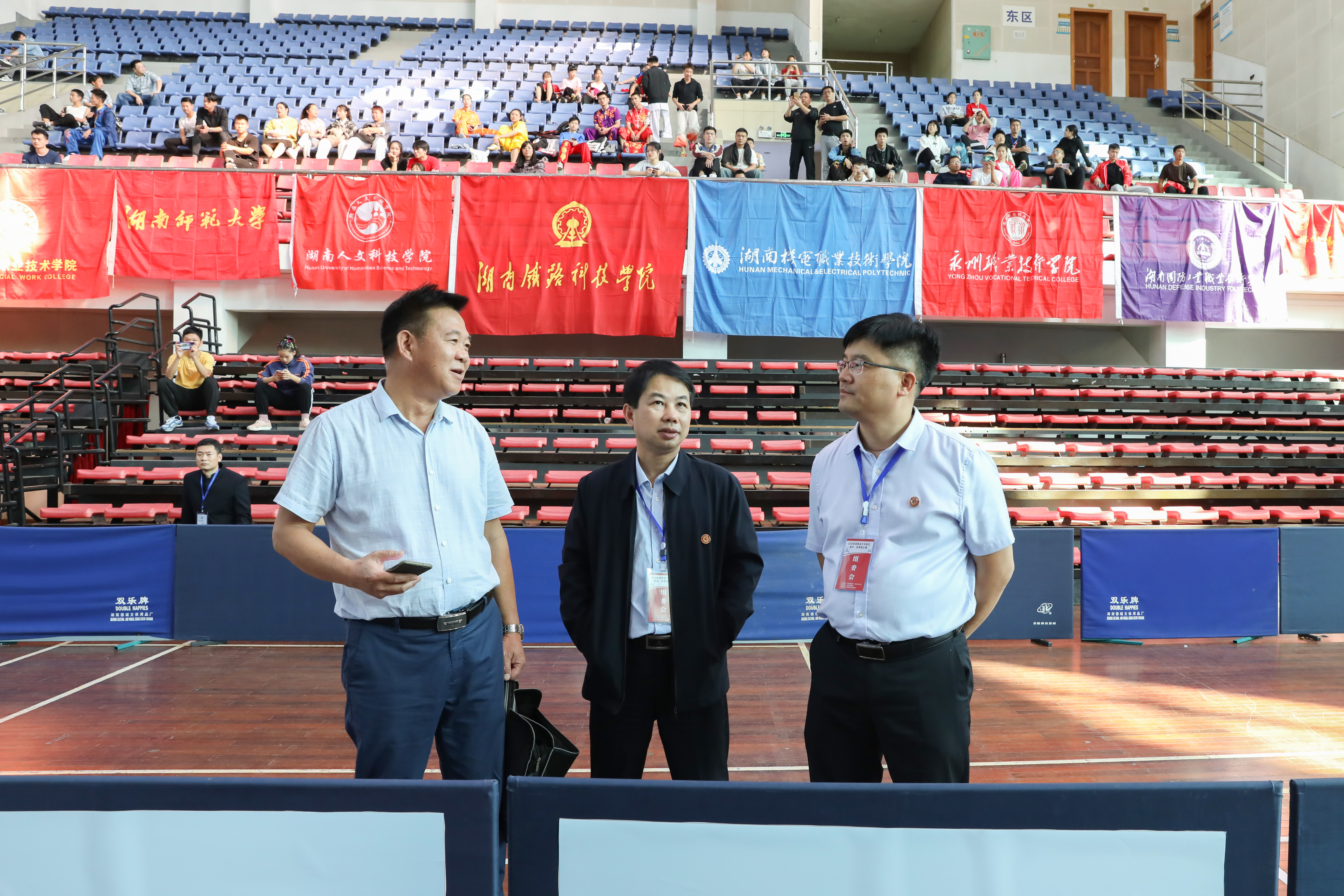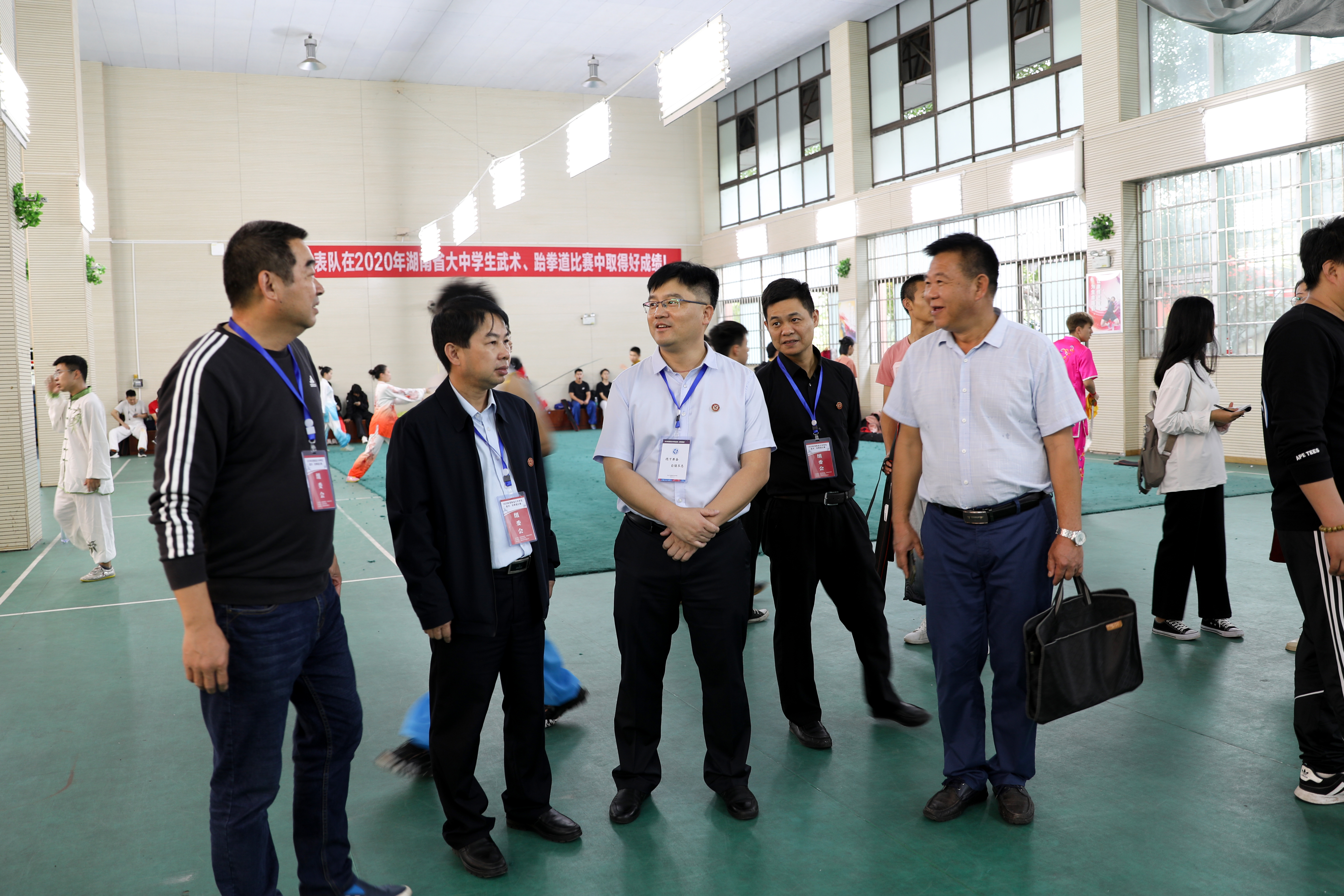 本网讯 11月19日,2020年湖南省大中学生武术、跆拳道比赛在伟德官网正式开赛。当天下午,校长李钢、副校长李常健一行来到体育馆,观摩正在进行的武术比赛。