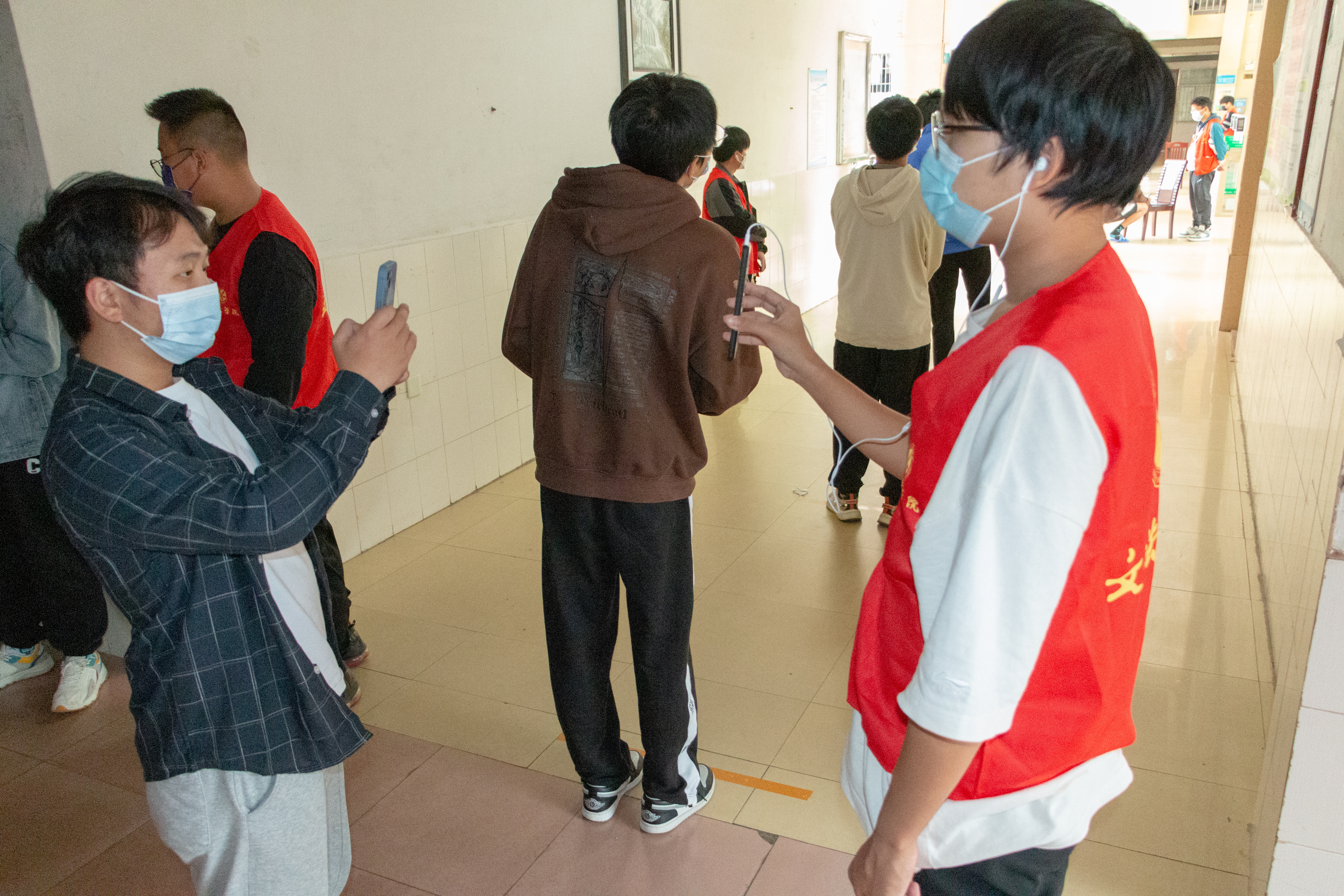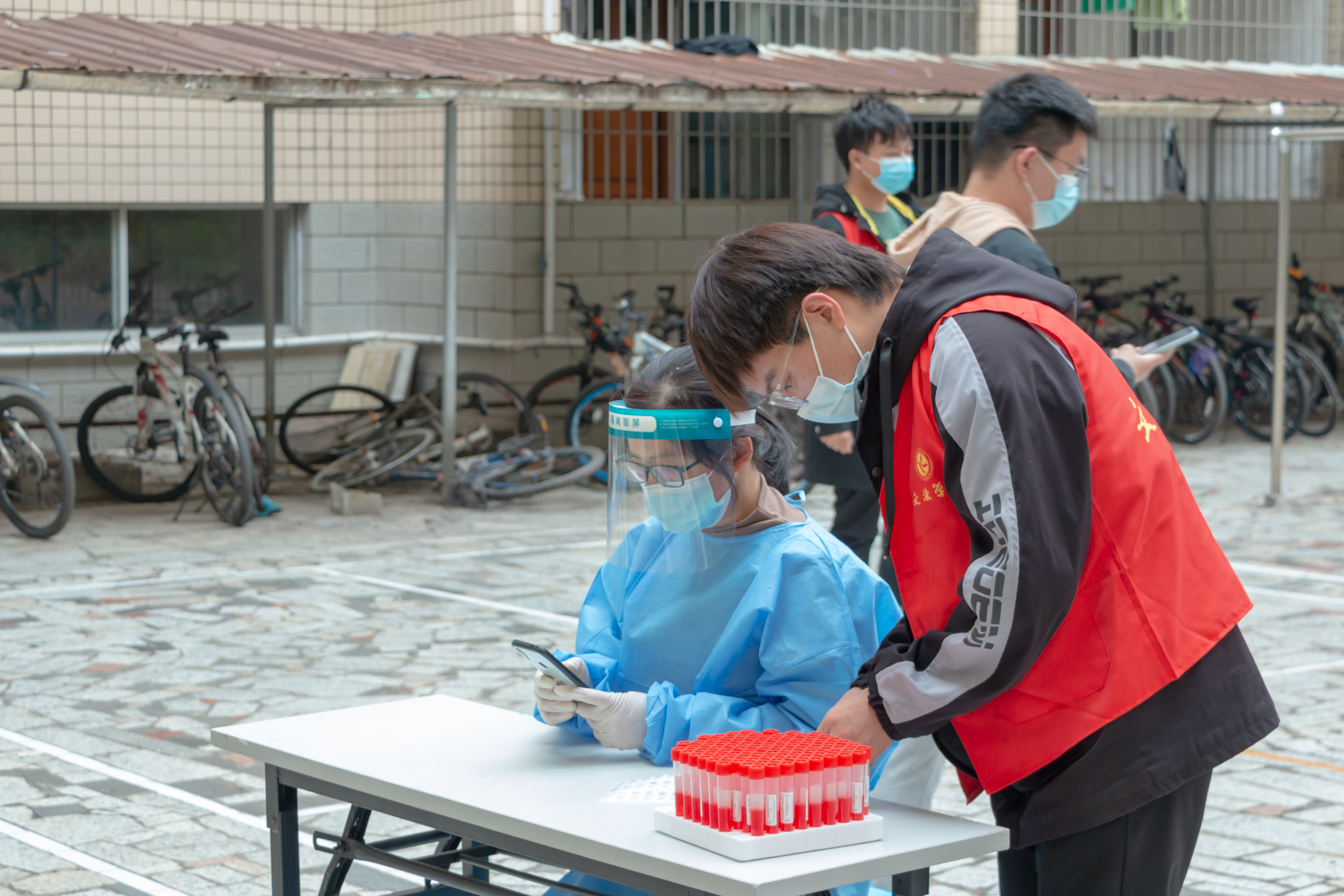 身穿志愿马甲的志愿者们穿梭其中