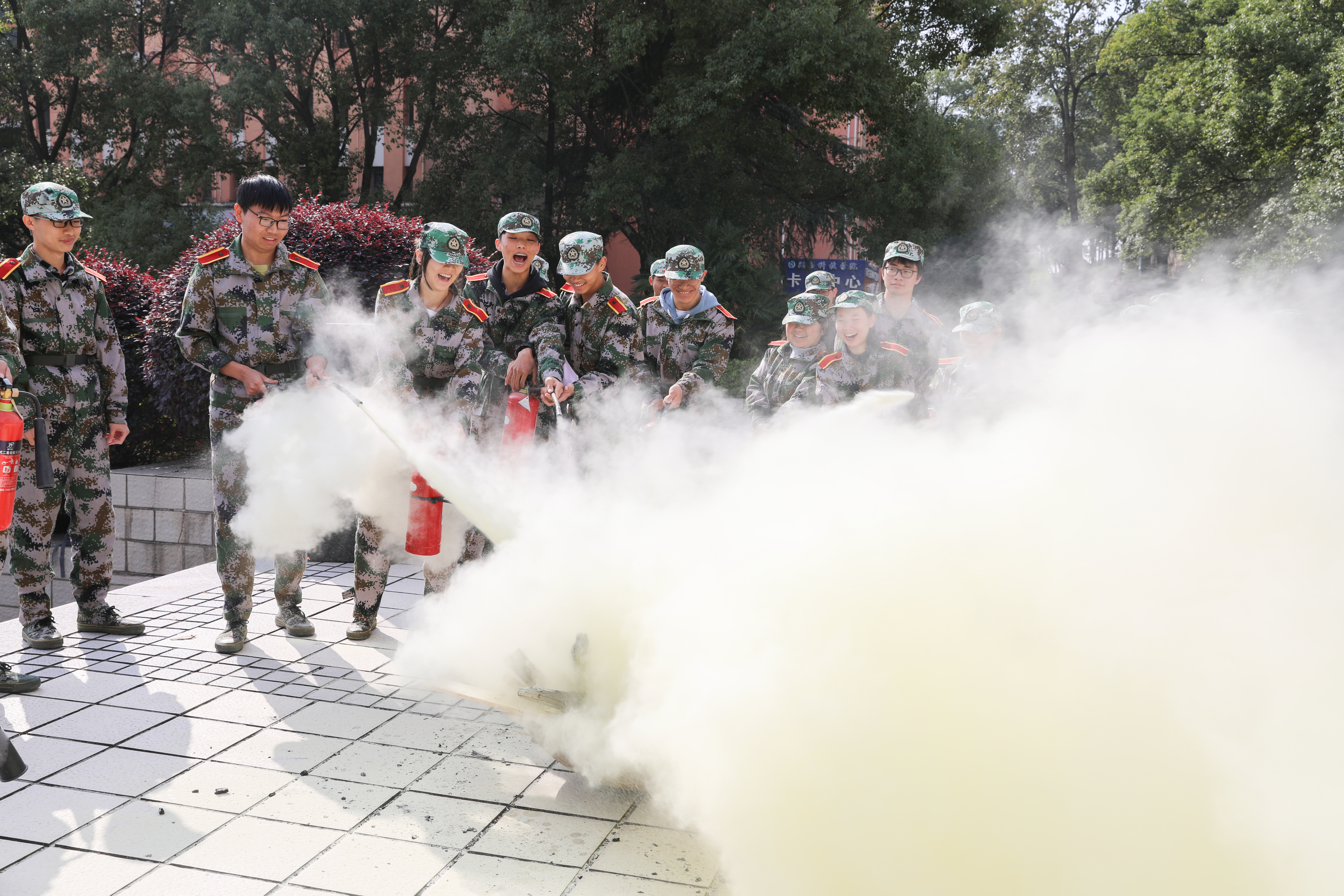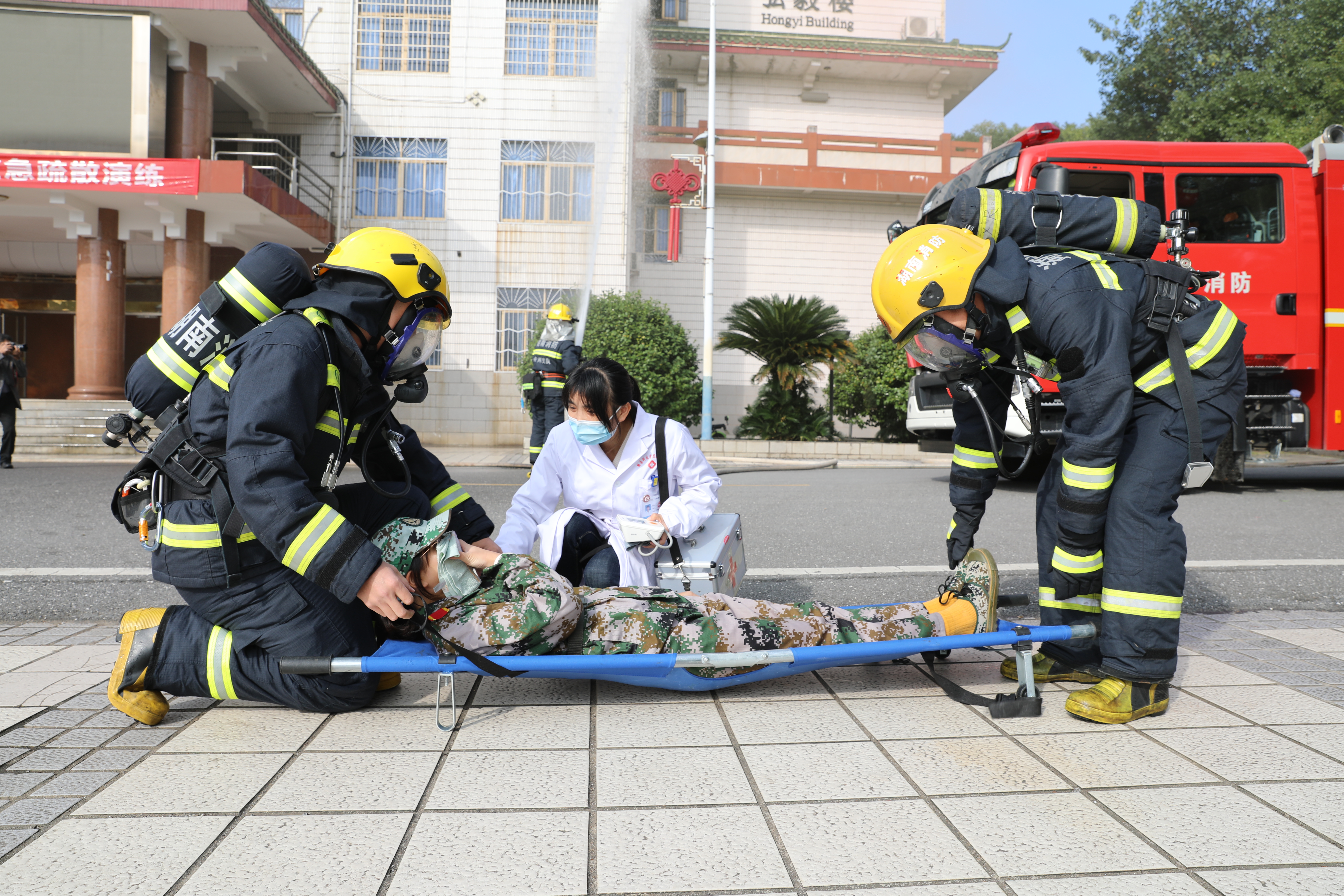上午九点整,弘毅楼4楼实验室出现橙棕色浓烟,随即一阵急促的警报声响起,浓烟迅速蔓延,整栋楼烟雾滚滚。火情一经发现,保卫处立即组织人员赶赴各楼层进行应急疏散并拨打119火警电话,应急救护组人员在一旁待命,随时准备急救。不到一分钟的时间,只见被困学生从所在楼层的两边沿中间楼梯移动,用衣物或沾满水的湿毛巾、手帕等捂住口鼻,低弯着腰,匍匐前进,有序下楼,紧急疏散撤离至文化广场。与此同时,消防大队顺利到达现场,迅速实施营救,所有被困学生顺利脱险。