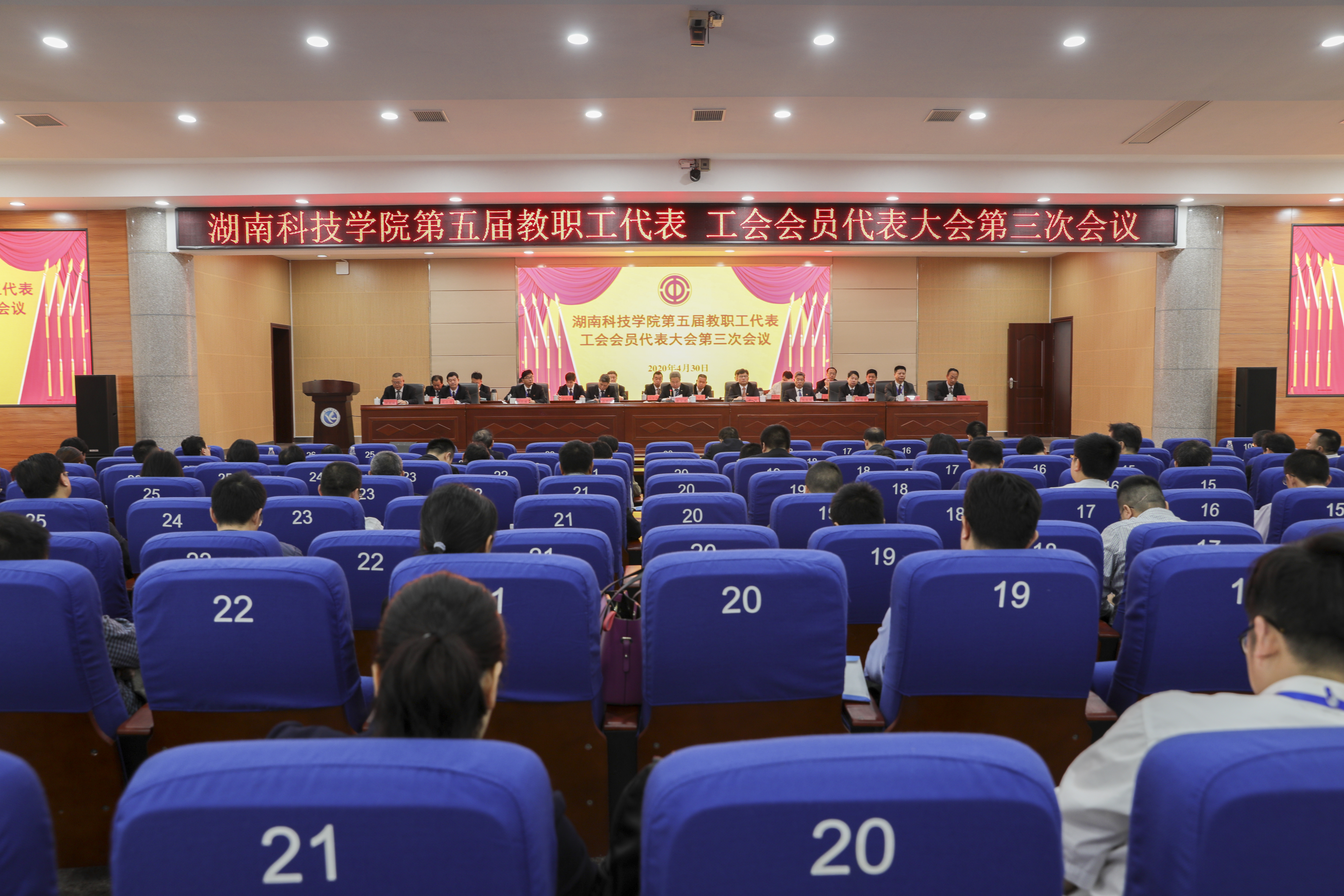 在雄壮的校歌声中,第五届教职工代表工会会员代表大会第三次会议胜利闭幕。