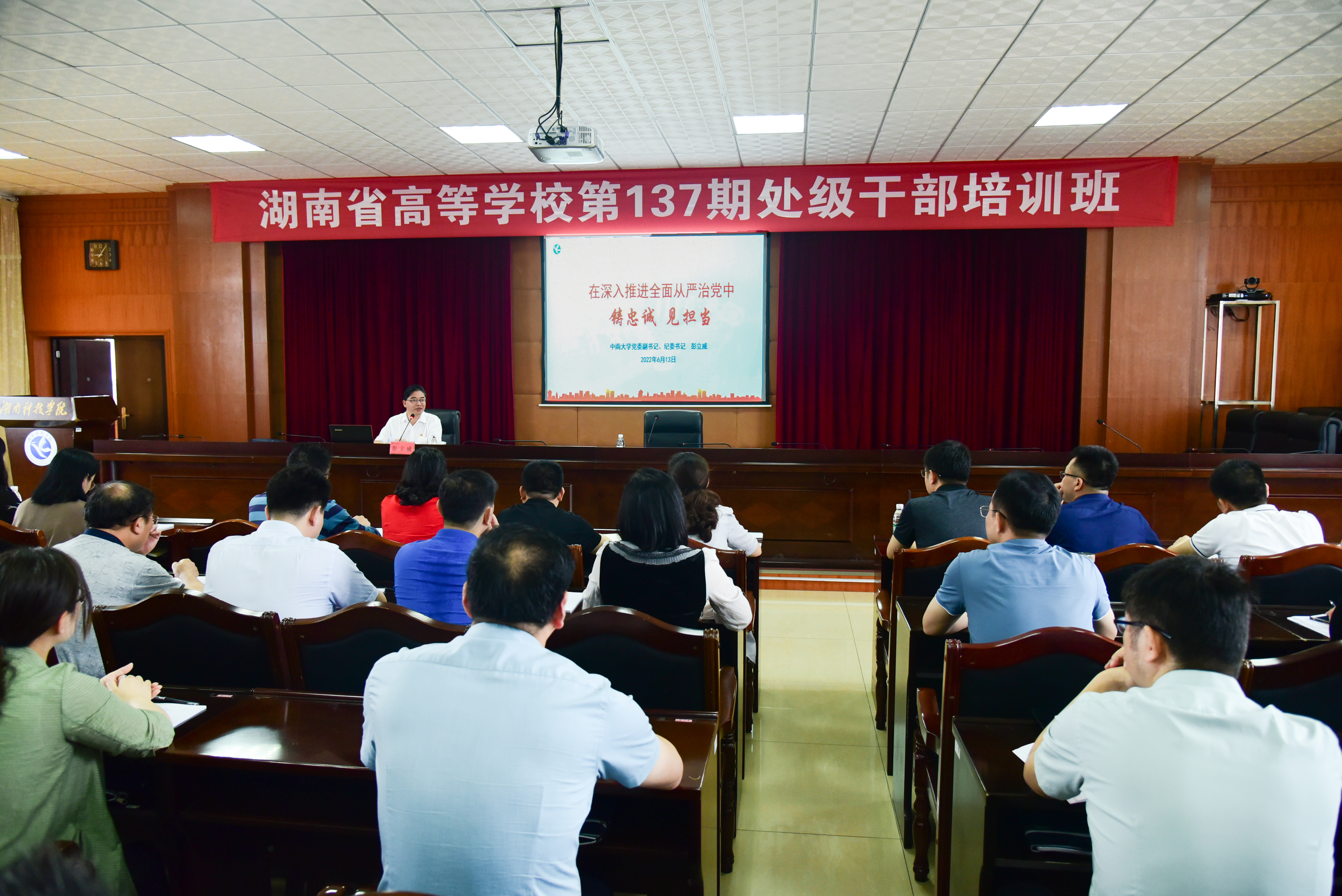 本网讯 6月13日,湖南省高等学校第137期处级干部培训班第十二次理论讲座开讲,邀请中南大学党委副书记、纪委书记彭立威作主题为“在深入推进全面从严治党中铸忠诚见担当”的专题讲座。校纪委书记陈灿军主持报告会。